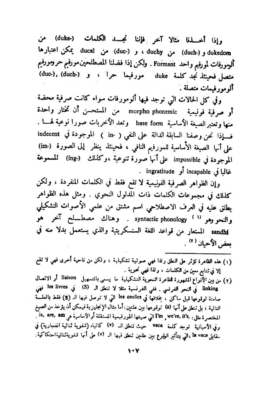وإن الظواهر الصرفية الفونيمية لا تقع فقط في الكلمات المنفردة، ولكن كذلك في مجموعات الكلمات ذات المدلول النحوي. ومثل هذه الظواهر يطلق عليه في العرف الاصطلاحي اسم مشتق من علمي الأصوات التشكيلي والنحو وهو1 syntactic phonology. وهناك مصطلح آخر هو sandhi المستعار من قواعد اللغة السنسكريتية والذي يستعمل بدلا منه في بعض الأحيان2.
