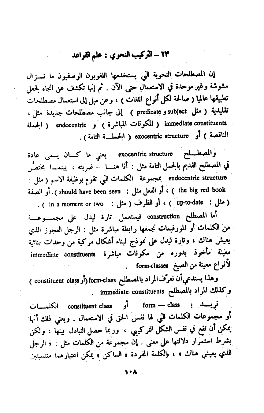 إن المصطلحات النحوية التي يستخدمها اللغويون الوصفيون ما تزال مشوشة وغير موحدة في الاستعمال حتى الآن، ثم إنها تكشف عن اتجاه لجعل تطبيقها عالميا "صالحة لكل أنواع اللغات"، وعن ميل إلى استعمال مصطلحات تقليدية "مثل: subject وpredicate" إلى جانب مصطلحات جديدة مثل: immediate constituents "المكونات المباشرة" وendocentric "الجملة الناقصة" أو exocentric structure "الجملة التامة".