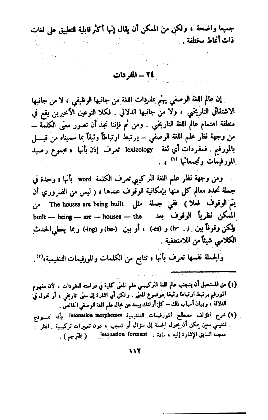 إن عالم اللغة الوصفي يهتم بمفردات اللغة من جانبها الوظيفي، لا من جانبها الاشتقاقي التاريخي، ولا من جانبها الدلالي، فكلا النوعين الأخيرين يقع في منطقة اهتمام عالم اللغة التاريخي، ومن ثم فإننا نجد أن تصور معنى الكلمة -من وجهة نظر علم اللغة الوصفي- يرتبط ارتباطًا وثيقًا بما سميناه من قبل بالمورفيم. فمفردات أي لغة lexicology تعرف إذن بأنها "مجموع رصيد المورفيمات وتجمعاتها1".