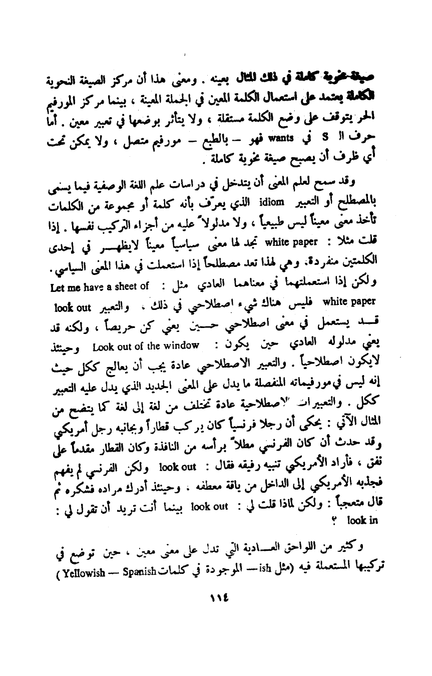 وقد سمح لعلم المعنى أن يتدخل في دراسات علم اللغة الوصفية فيما يسمى بالمصطلح أو التعبير idiom الذي يعرف بأنه كلمة أو مجموعة من الكلمات تأخذ معنى معينًا ليس طبيعيًا، ولا مدلولا عليه من أجزاء التركيب نفسها. إذا قلت مثلا: white paper تجد لها معنى سياسيًا معينًا لا يظهر في إحدى الكلمتين منفردة، وهي لهذا تعد مصطلحًا إذا استعملت في هذا المعنى السياسي. ولكن إذا استعملتهما في معناهما العادي مثل: Let me have a sheet of white paper فليس هناك شيء اصطلاحي في ذلك، والتعبير look out قد يستعمل في معنى اصطلاحي حين يعني حريصًا، ولكنه قد يعني مدلوله العادي حين يكون: Look out of the window وحينئذ لا يكون اصطلاحيًا والتعبير الاصطلاحي عادة يجب أن يعالج ككل حيث إنه ليس في مورفيماته المنفصلة ما يدل على المعنى الجديد الذي يدل عليه التعبير ككل. والتعبيرات الاصطلاحية عادة تختلف من لغة إلى لغة كما يتضح من المثال الآتي: يحكى أن رجلا فرنسيًا كان يركب قطارًا وبجانبه، رجل أمريكي وقد حدث أن كان الفرنسي مطلا برأسه من النافذة وكان القطار مقدمًا على نفق، فأراد الأمريكي تنبيه رفيقه فقال: look out ولكن الفرنسي لم يفهم فجذبه الأمريكي إلى الداخل من ياقة معطفه، وحينئذ أدرك مراده فشكره ثم قال متعجبًا: ولكن لماذا قلت لي: Look out بينما أنت تريد أن تقول لي: Look in؟