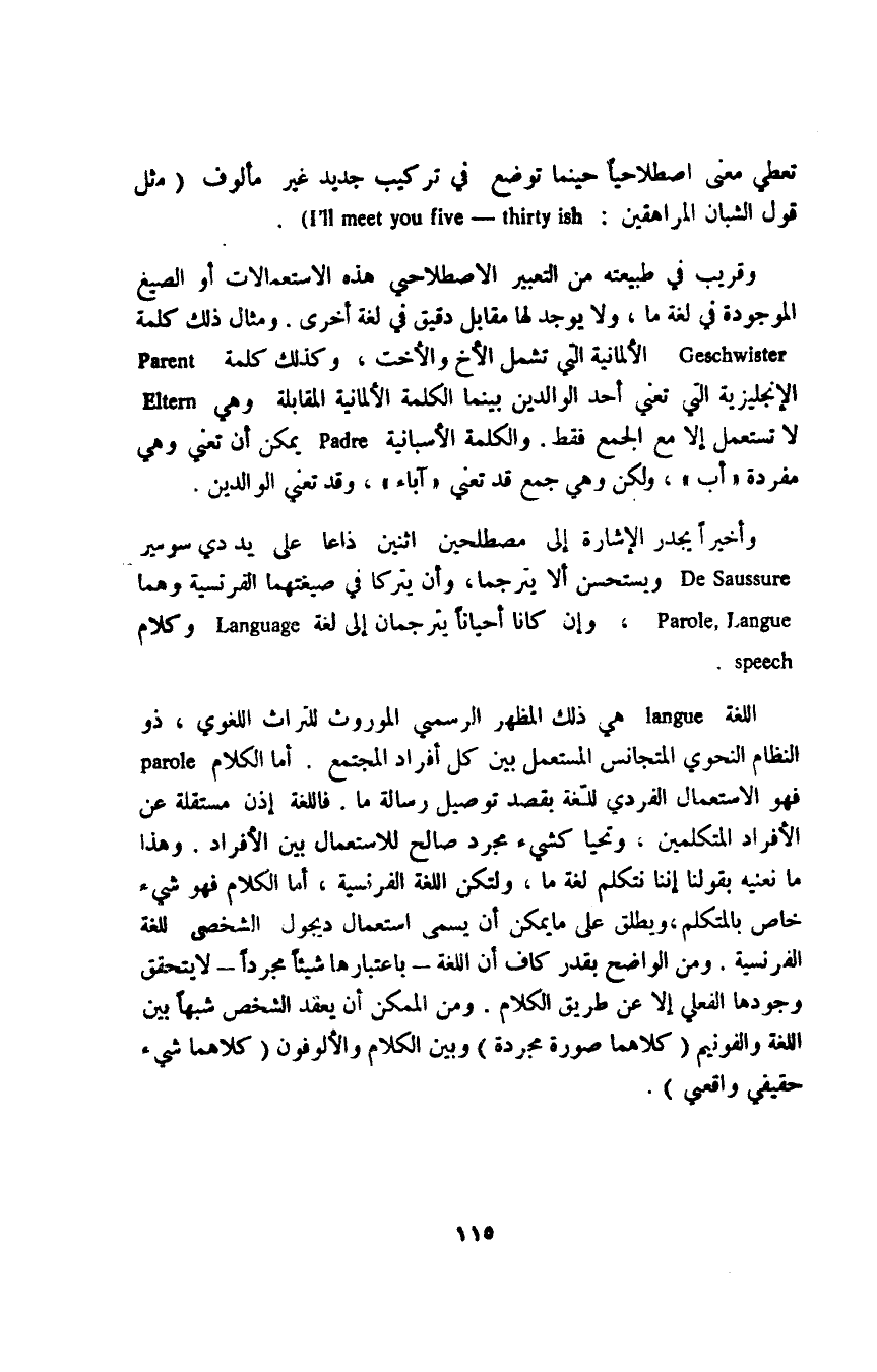 وأخيرًا يجدر الإشارة إلى مصطلحين اثنين ذاعا على يد دي سوسير De Saussure ويستحسن ألا يترجما، وأن يتركا في صيغتهما الفرنسية وهما parole, Iangue, وإن كانا أحيانًَا يترجمان إلى لغة Language وكلام speech.