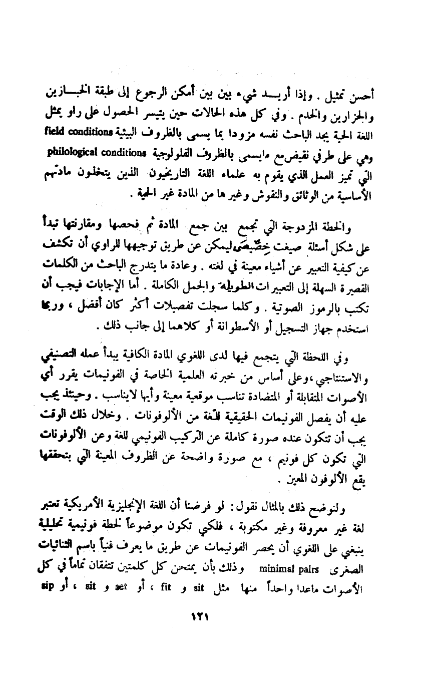 أحسن تمثيل وإذا أريد شيء بين بين أمكن الرجوع إلى طبقة الخبازين والجزارين والخدم، وفي كل هذه الحالات حين يتيسر الحصول على راو يمثل اللغة الحية يجد الباحث نفسه مزودا بما يسمى بالظروف البيئية field conditions وهي على طرفي نقيض مع ما يسمى بالظروف الفلولوجية philological conditions التي تميز العمل الذي يقوم به علماء اللغة التاريخيون الذين يتخذون مادتهم الأساسية من الوثائق والنقوش وغيرها من المادة غير الحية.