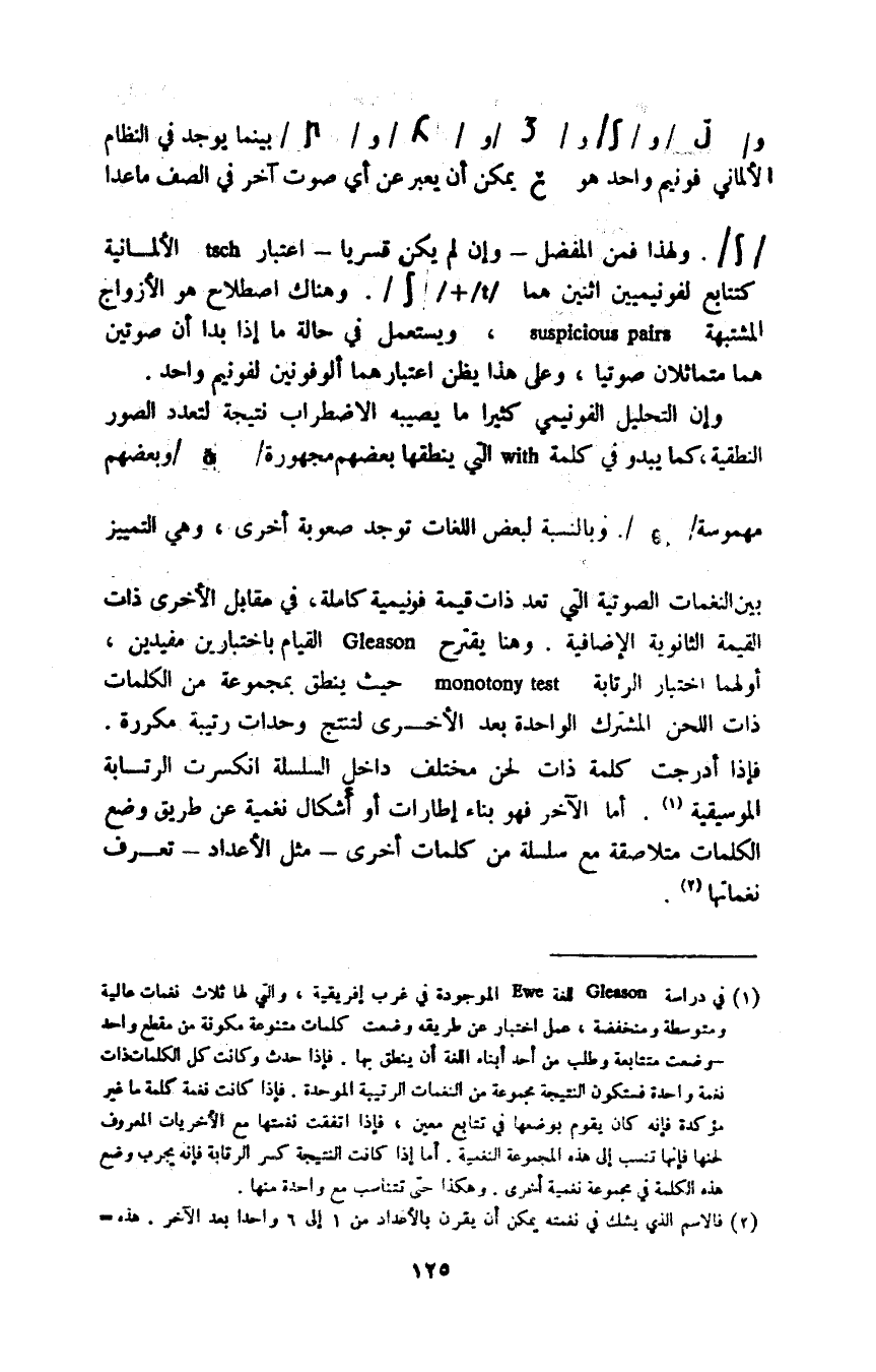 1 في دراسة Glesson اللغة Ewe الموجودة في غرب إفريقية، والتي لها ثلاث نغمات عالية ومتوسطة ومنخفضة، عمل اختبار عن طريقه وضعت كلمات متنوعة مكونة من مقطع واحد وضعت متتابعة وطلب من أحد أبناء اللغة أن ينطلق بها. فإذا حدث وكانت الكلمات ذات نغمة، واحدة فتكون النتيجة مجموعة من النغمات الرتيبة الموحدة، فإذا كانت نغمة كلمة ما غير مؤكدة فإنه كان يقوم بوضعها في تتابع معين، فإذا اتفقت نغمتها مع الأخريات المعروف لحنها فإنها تنسب إلى هذه المجموعة النغمية. أما إذا كانت النتيجة كسر الرتابة فإنه يجرب وضع هذه الكلمة في مجموعة نغمية أخرى، وهكذا حتى تتناسب مع واحدة منها.