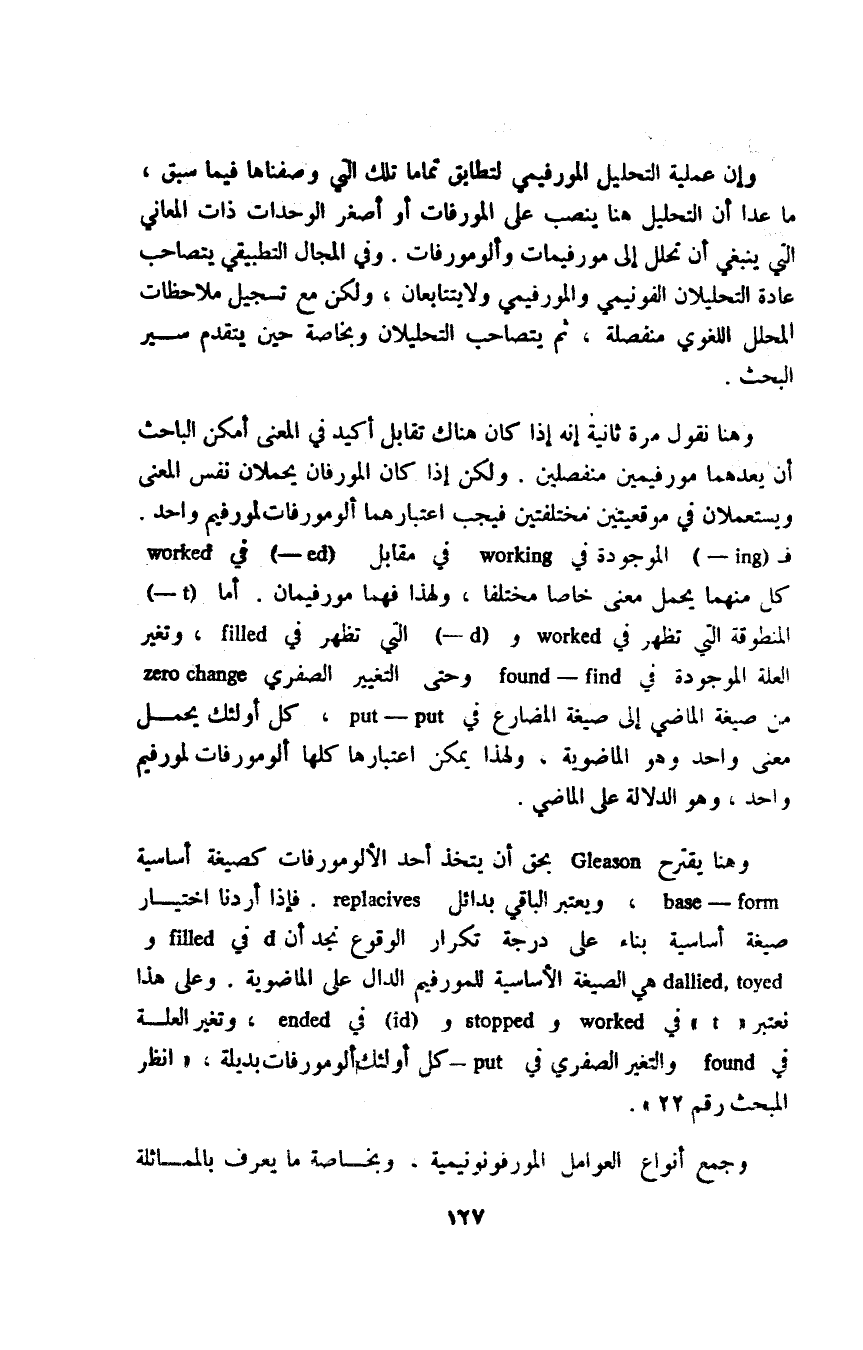 وهنا يقترح Gleason بحق أن يتخذ أحد الألومورفات كصيغة أساسية basem, form، ويعتبر الباقي بدائل replacices فإذا أردنا اختيار صيغة أساسية بناء على درجة تكرار الوقوع نجد أن d في filled وdallied, toyed هي الصيغة الأساسية للمورفيم الدال على الماضوية، وعلى هذا نعتبر "t" في worked وstopped و"id" في ended، وتغير العلة في found والتغير الصفري في put كل أولئك ألومورفات بديلة، "انظر المبحث رقم22".