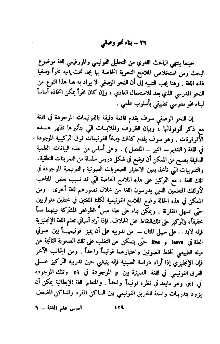 حينما ينتهي الباحث اللغوي من التحليل الفونيمي والمورفيمي للغة موضوع البحث ومن استخلاص الملامح النحوية الخاصة بها يجد بها تحت يديه نحوًا وصفيا لهذه اللغة، وهنا يجب التنبيه إلى أن النحو الوصفي لا يراد به هنا هذا النوع من النحو المدرسي الذي يعد للاستعمال العادي، وإن كان نحوًا يمكن اتخاذه أساسًا لبناء نحو مدرسي تطبيقي بأسلوب علمي.