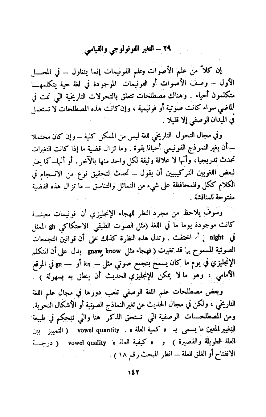 وبعض مصطلحات علم اللغة الوصفي تلعب دورها في مجال علم اللغة التاريخي، ولكن في مجال الحديث عن تغير النماذج الصوتية أو الأشكال النحوية ومن المصطلحات الوصفية التي تستحق الذكر هنا والتي تتحكم في طبيعة التغيير المعين ما يسمى بـ "كمية العلة" vowel quantity "التمييز بين العلة الطويلة والقصيرة" و"كيفية العلة" vowel quality "درجة الانفتاح أو الغلق للعلة, انظر المبحث رقم 18".