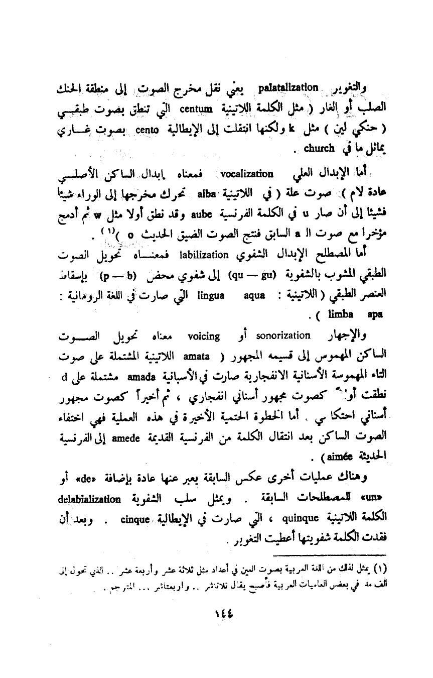 وهناك عمليات أخرى عكس السابقة يعبر عنها بإضافة "de" أو "un" للمصطلحات السابقة ويمثل سلب الشفوية delabialization الكلمة اللاتينية quinque، التى صارت في الإيطالية cinque، وبعد أن فقدت الكلمة شفويتها أعطيت التغوير.