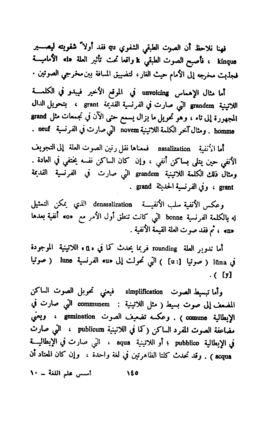 فهنا نلاحظ أن الصوت الطبقي الشفوي qu فقد أولا شفويته ليصير kinque فأصبح الصوت الطبقي k واقعا تحت تأثير العلة "i" الأمامية فجذبت مخرجه إلى الأمام حيث الغار، لتضييق المسافة بين مخرجي الصوتين.