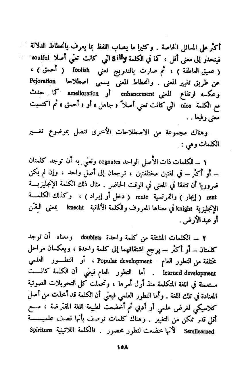 2- الكلمات المشتقة من كلمة واحدة doublets ومعناه أن توجد كلمتان -أو أكثر- يرجع اشتقاقهما إلى كلمة واحدة، ويعكسان مراحل مختلفة من التطور العام popular development، أو التطور العلمي Iearned development. أما التطور العام فيعني أن الكلمة كانت مستعملة في اللغة المتكلمة منذ أول أمرها،، وتحملته كل التحويلات الصوتية المعتادة في تلك اللغة، وأما التطور العلمي فيعني أن الكلمة قد أخذت من أصل كلاسيكي لغرض علمي أو أدبي ثم أخضعت لطبيعة اللغة المقترضة، مع أقل قدر ممكن من التغيير، وهناك كلمات، توصف بأنها نصف علمية Semilearned لأنها خضعت لتطور محصور، فالكلمة اللاتينية spiritum