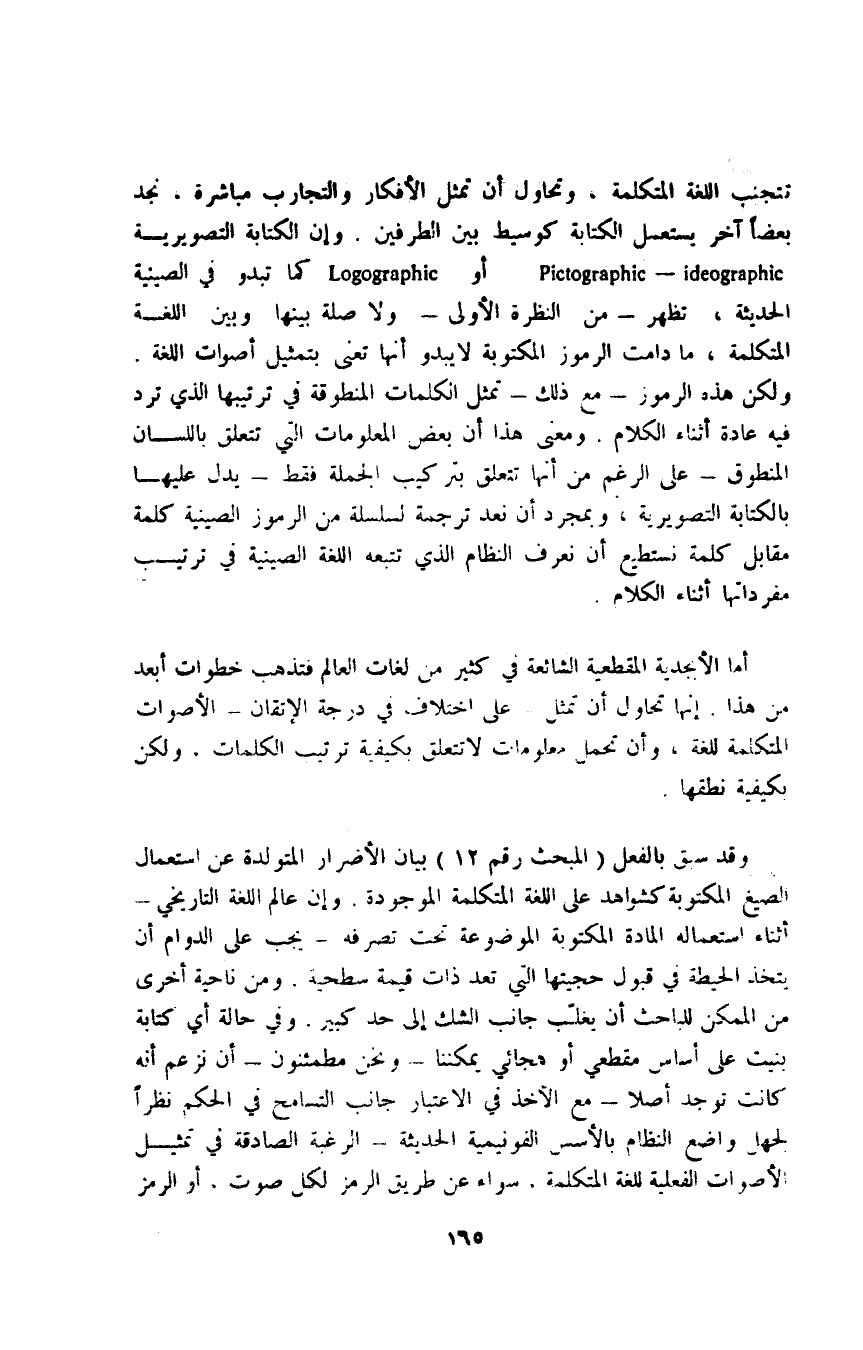 تتجنب اللغة المتكلمة، وتحاول أن تمثل الأفكار والتجارب مباشرة، نجد بعضًا آخر يستعمل الكتابة كوسيط بين الطرفين، وإن الكتابة التصويرية pictographic-ideographic أو Logographic كما تبدو في الصينية الحديثة, تظهر -من النظرة الأولى- ولا صلة بينها وبين اللغة المتكلمة، ما دامت الرموز المكتوبة لا يبدو أنها تعنى بتمثيل أصوات اللغة، ولكن هذه الرموز -مع ذلك- تمثل الكلمات المنطوقة في ترتيبها الذي ترد فيه عادة أثناء الكلام، ومعنى هذا أن بعض المعلومات التي تتعلق باللسان المنطوق -على الرغم من أنها تتعلق بتركيب الجملة فقط- يدل عليها بالكتابة التصويرية وبمجرد أن نعد ترجمة لسلسلة من الرموز الصينية كلمة مقابل كلمة نستطيع أن نعرف النظام الذي تتبعه اللغة الصينية في ترتيب مفرداتها أثناء الكلام.