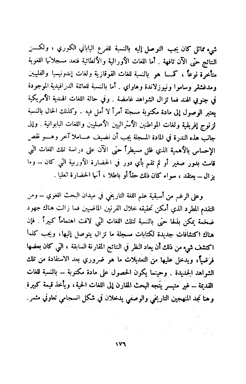 شيء مماثل كان يجب التوصل إليه بالنسبة للفرع الياباني الكوري، ولكن النتائج حتى الآن تافهة، أما اللغات الأورالية والألطائية فتعد مسجلاتها اللغوية متأخرة، نوعًا، كما هو بالنسبة للغات القوقازية ولغات إندونيسيا والفليبين ومدغشقر وساموا ونيوزلاندة وهاواي، أما بالنسبة للعائلة الدرافيدية الموجودة في جنوبي الهند فما تزال الشواهد غامضة وفي حال اللغات الهندية الأمريكية يعتبر الوصول إلى مادة مكتوبة مسجلة أمرا لا أمل فيه، وكذلك الحال بالنسبة لزنوج إفريقية ولغات المواطنين الأستراليين الأصليين واللغات البابوانية، وإلى جانب هذه الندرة في المادة المسجلة يجب أن نضيف عاملا آخر وهو نقص الإحساس بالأهمية الذي ظل مسيطرًا حتى الآن على دراسة تلك اللغات التي قامت بدور صغير أو لم تقم بأي دور في الحضارة الأوربية التي كان -وما يزال- يعتقد، سواء كان ذلك حقًا أو باطلا، أنها الحضارة العليا.