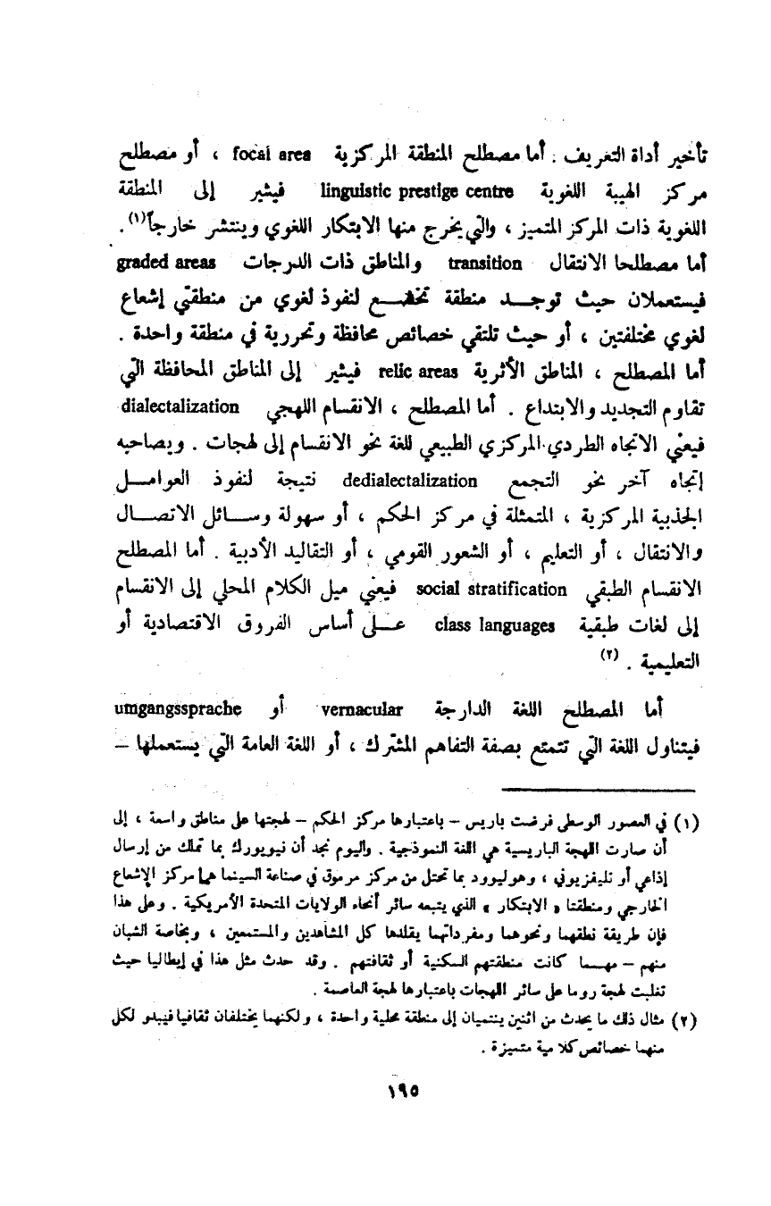 أما مصطلحا الانتقال transition والمناطق ذات الدرجات graded areas فيستعملان حيث توجد منطقة تخضع لنفوذ لغوي من منطقتي إشعاع لغوي مختلفتين، أو حيث تلتقي خصائص محافظة وتحررية في منطقة واحدة. أما المصطلح، المناطق الأثرية relic areas فيشير إلى المناطق المحافظة التي تقاوم التجديد والابتداع. أما المصطلح، الانقسام اللهجي dialectalization فيعني الاتجاه الطردي المركزي الطبعي للغة نحو الانقسام إلى لهجات، ويصاحبه اتجاه آخر نحو التجمع dedialectalization نتيجة لنفوذ العوامل الجذبية المركزية، المتمثلة في مركز الحكم، أو سهولة وسائل الاتصال والانتقال، أو التعليم، أو الشعور القومي، أو التقاليد الأدبية، أما المصطلح الانقسام الطبقي social stratification فيعني ميل الكلام المحلي إلى الانقسام إلى لغات طبقية class languages على أساس الفروق الاقتصادية أو التعليمية2.