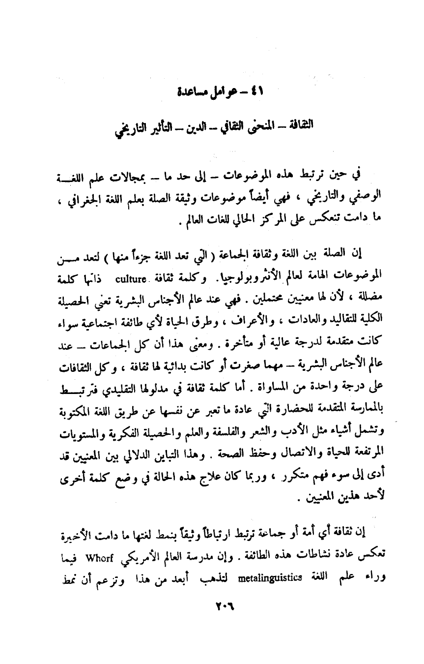إن ثقافة أي أمة أو جماعة ترتبط ارتباطا وثيقا بنمط لغتها ما دامت الأخيرة تعكس عادة نشاطات هذه الطائفة. وإن مدرسة العالم الأمريكي Whorf فيما وراء علم اللغة metalinguistics لتذهب أبعد من هذا وتزعم أن نمط