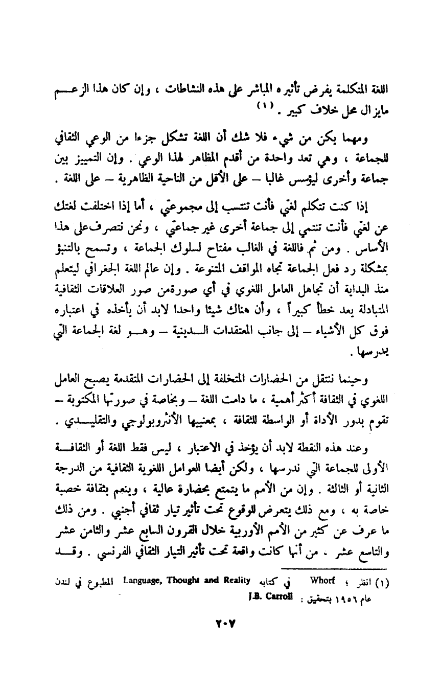 1 انظر Whorf في كتابه Language, Thought and Reality المطبوع في لندن عام 1956 بتحقيق: J.B. Carroll.