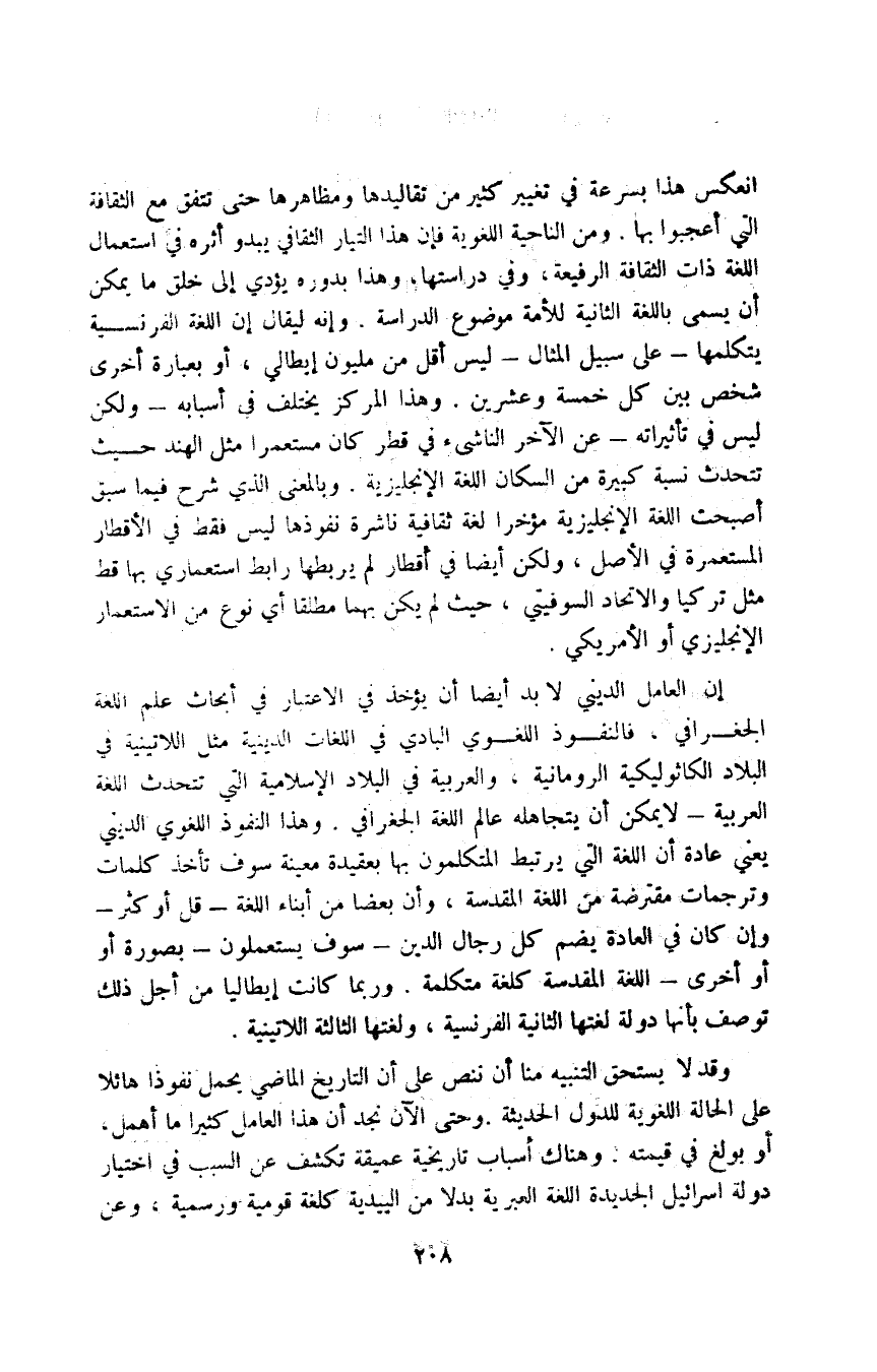 وقد لا يستحق التنبيه منا أن ننص على أن التاريخ الماضي يحمل نفوذا هائلا على الحالة اللغوية للدول الحديثة. وحتى الآن نجد أن هذا العامل كثيرا ما أهمل، أو بولغ في قيمته. وهناك أسباب تاريخية عميقة تكشف عن السبب في اختيار دولة إسرائيل الجديدة اللغة العربية بدلا من البيدية كلغة قومية ورسمية، وعن