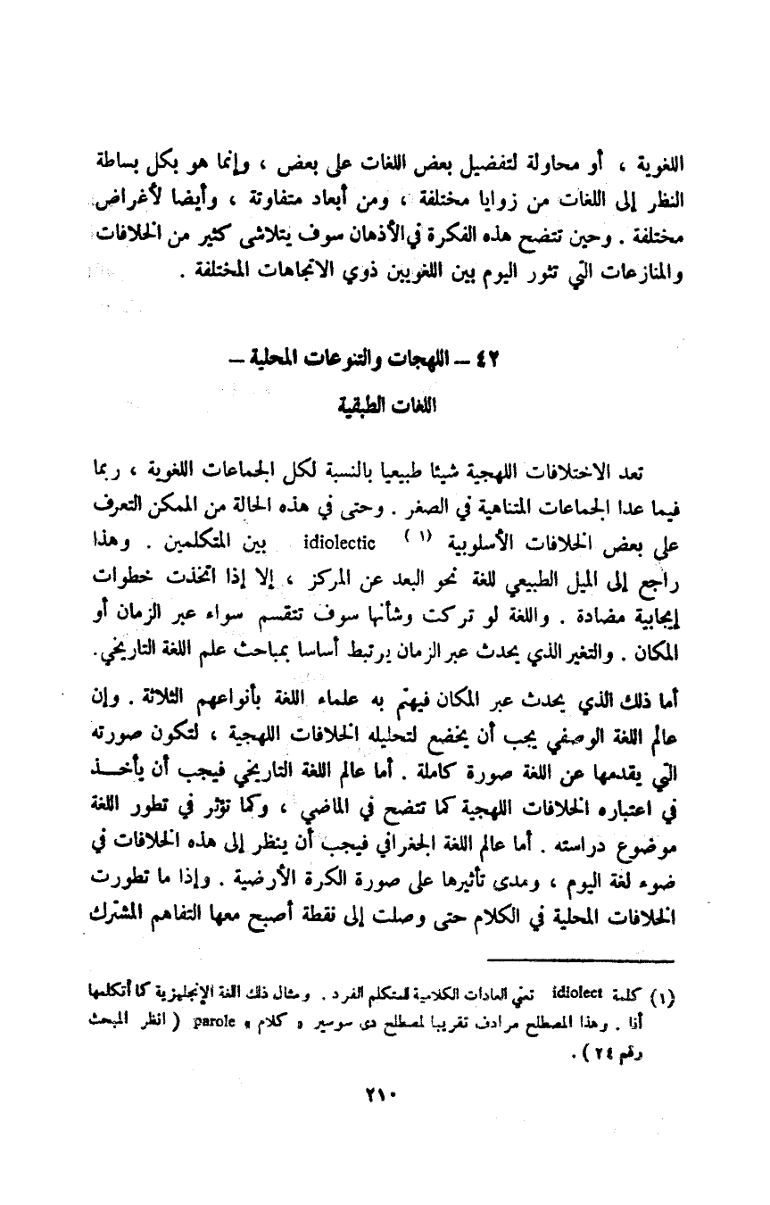1 كلمة Idiolect تعنى العادات الكلامية للمتكلم الفرد، ومثال ذلك اللغة الإنجليزية كما أتكلمها أنا. وهذا المصطلح مرادف تقريبا لمصطلح دي سوسير "كلام" Parole "انظر المبحث رقم 24".