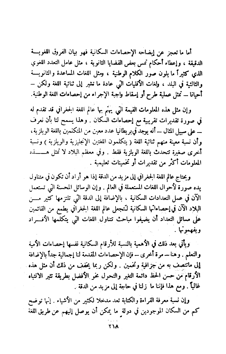 أما ما تعجز عن إيضاحه الإحصاءات السكانية فهو بيان الفروق اللغوية الدقيقة، وإعطاء أحكام تمس بعض القضايا الثانوية، مثل عامل التعدد اللغوي الذي كثيرا ما يلون صور الكلام الوطنية، ومثل اللغات المساعدة والثانوية والثالثية في البلد، ولغات الأقليات التي عادة ما تشير إلى ثنائية اللغة ولكن -أحيانا- تمثل عملية طرح أو إسقاط واجبة الإجراء من إحصاءات اللغة الوطنية.