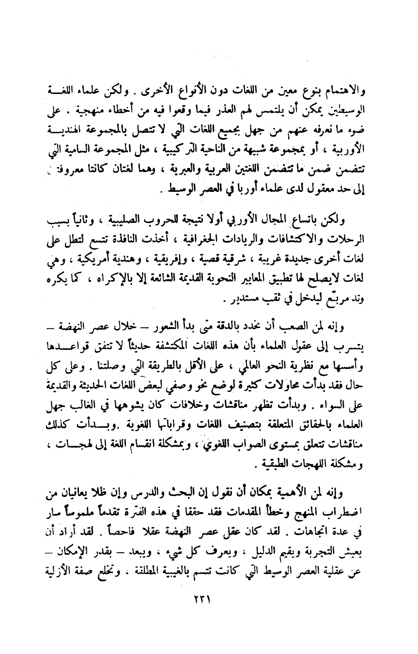 ولكن باتساع المجال الأوربي أولا نتيجة للحروب الصليبية، وثانيا بسبب الرحلات والاكتشافات والريادات الجغرافية، أخذت النافذة تتسع لتطل على لغات أخرى جديدة غريبة، شرقية قصية، وإفريقية، وهندية أمريكية، وهي لغات لا يصلح لها تطبيق المعايير النحوية القديمة الشائعة إلا بالإكراه، كما يكره وتد مربع ليدخل في ثقب مستدير.