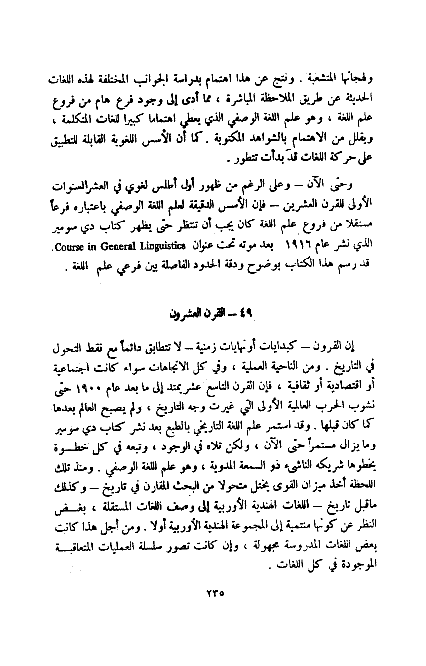 إن القرون -كبدايات أو نهايات زمنية- لا تتطابق دائما مع نقط التحول في التاريخ, ومن الناحية العملية، وفي كل الاتجاهات سواء كانت اجتماعية أو اقتصادية أو ثقافية، فإن القرن التاسع عشر يمتد إلى ما بعد عام 1900 حتى نشوب الحرب العالمية الأولى التي غيرت وجه التاريخ، ولم يصبح العالم بعدها كما كان قبلها, وقد استمر علم اللغة التاريخي بالطبع بعد نشر كتاب دي سوسير وما يزال مستمرا حتى الآن، ولكن تلاه في الوجود، وتبعه في كل خطوة يخطوها شريكه الناشئ ذو السمعة المدوية، وهو علم اللغة الوصفي، ومنذ تلك اللحظة أخذ ميزان القوى يختل متحولا من البحث المقارن في تاريخ -وكذلك ما قبل تاريخ- اللغات الهندية الأوربية أولا, ومن أجل هذا كانت بغض النظر عن كونها منتمية إلى المجموعة الهندية الأوربية أولا، ومن أجل هذا كانت بعض اللغات المدروسة مجهولة، وإن كانت تصور سلسلة العمليات المتعاقبة الموجودة في كل اللغات.