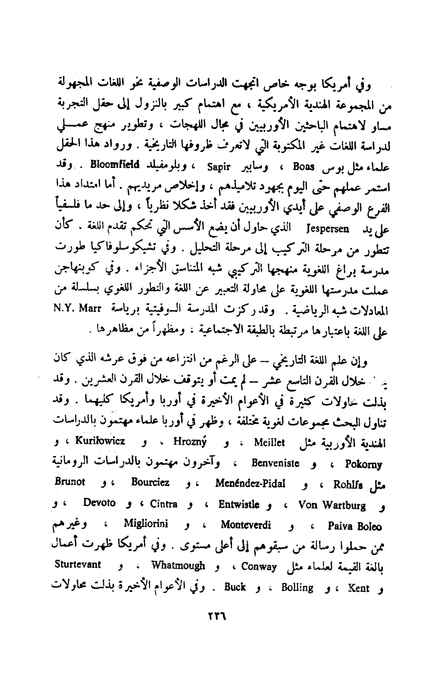 وإن علم اللغة التاريخي -على الرغم من انتزاعه من فوق عرشه الذي كان يحتله خلال القرن التاسع عشر- لم يمت أو يتوقف خلال القرن العشرين, وقد بذلت محاولات كثيرة في الأعوام الأخيرة في أوربا وأمريكا كليهما, وقد تناول البحث مجموعات لغوية مختلفة، وظهر في أوربا علماء مهتمون بالدراسات الهندية الأوربية مثل Meillet, وHrozny وKurilowicz، وPokorny، وBenveniste، وآخرون مهتمون بالدراسات الرومانية مثل Rohifs، وMenendez-Pidal، وBourciez، وBrunot، وVon Wartburg، وEntwistle، وCintra، وDevoto، وPaiva Boleo، وMonteverdi، وMigliorini، وغيرهم ممن حملوا رسالة من سبقوهم إلى أعلى مستوى, وفي أمريكا ظهرت أعمال بالغة القيمة لعلماء مثل Conway، وWhatmough، وStrtevant، وKent، وBolling، وBuck, وفي الأعوام الأخيرة بذلت محاولات