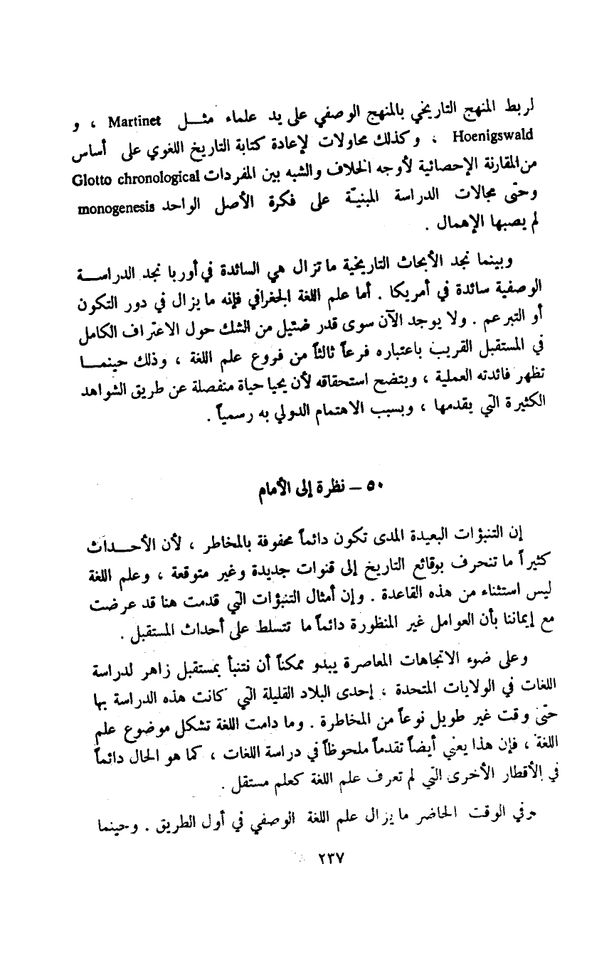 لربط المنهج التاريخي بالمنهج الوصفي على يد علماء مثل Martinet, وHoenigswald، وكذلك محاولات لإعادة كتابة التاريخ اللغوي على أساس من المقارنة الإحصائية لأوجه الخلاف والشبه بين المفردات Glotto chronological، وحتى مجالات الدراسة المبنية على فكرة الأصل الواحد monogenesis لم يصبها الإهمال.