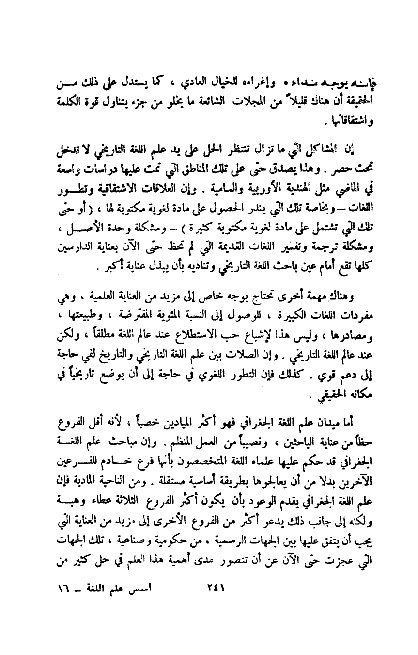 وهناك مهمة أخرى تحتاج بوجه خاص إلى مزيد من العناية العلمية، وهي مفردات اللغات الكبيرة، للوصول إلى النسبة المئوية المقترضة، وطبيعتها، ومصادرها، وليس هذا الإشباع حب الاستطلاع عند عالم اللغة مطلقا، ولكن عند عالم اللغة التاريخي. وإن الصلات بين علم اللغة التاريخي والتاريخ لفي حاجة إلى دعم قوي. كذلك فإن التطور اللغوي في حاجة إلى أن يوضع تاريخيا في مكانه الحقيقي.