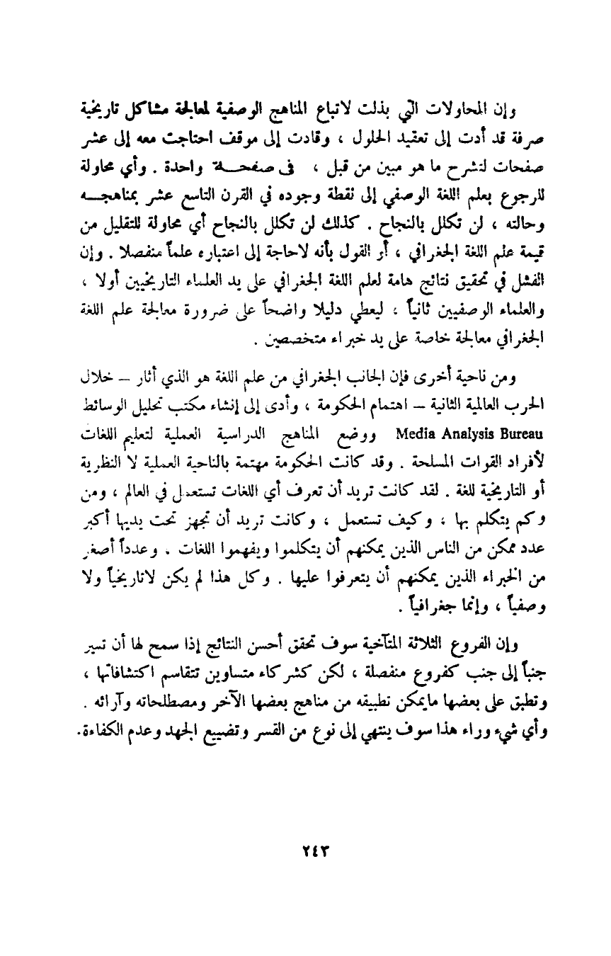 ومن ناحية أخرى فإن الجانب الجغرافي من علم اللغة هو الذي أثار -خلال الحرب العالمية الثانية- اهتمام الحكومة، وأدى إلى إنشاء مكتب تحليل الوسائط Media Analysis Bureau ووضع المناهج الدراسية العملية لتعليم اللغات لأفراد القوات المسلحة. وقد كانت الحكومة مهتمة بالناحية العملية لا النظرية أو التاريخية للغة. لقد كانت تريد أن تعرف أي اللغات تستعمل في العالم، ومن وكم يتكلم بها، وكيف تستعمل، وكانت تريد أن تجهز تحت يديها أكبر عدد ممكن من الناس الذين يمكنهم أن يتكلموا ويفهموا اللغات، وعددا أصغر من الخبراء الذين يمكنهم أن يتعرفوا عليها, وكل هذا لم يكن لا تاريخيا ولا وصفيا، وإنما جغرافيا, وإن الفروع الثلاثة المتآخية سوف تحقق أحسن النتائج إذا سمح لها أن تسير جنبا إلى جنب كفروع منفصلة، لكن كشركاء متساوين تتقاسم اكتشافاتها، وتطبق على بعضها ما يمكن تطبيقه من مناهج بعضها الآخر ومصطلحاته وآرائه. وأي شيء وراء هذا سوف ينتهي إلى نوع من القسر وتضييع الجهد وعدم الكفاءة.