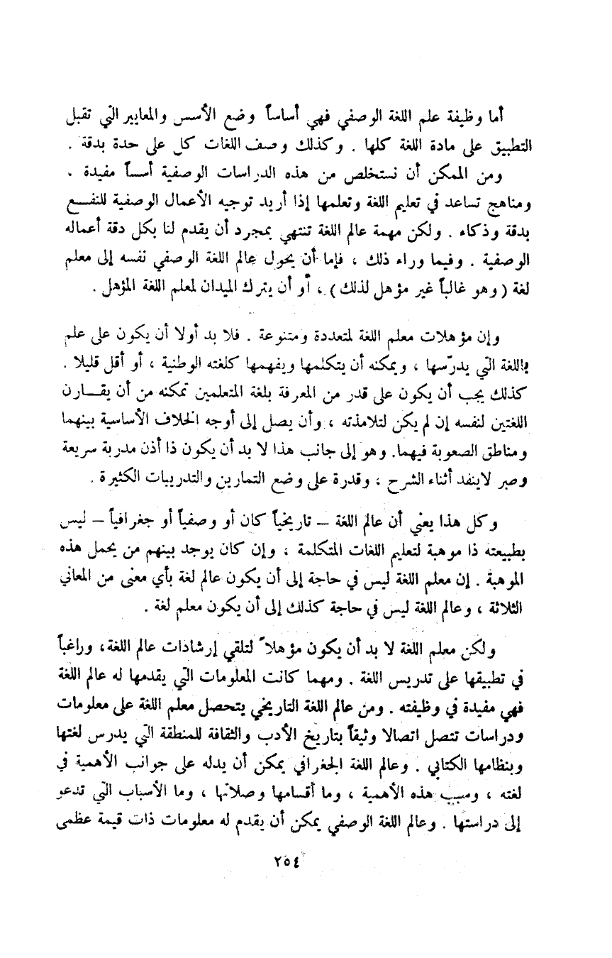 وكل هذا يعني أن عالم اللغة -تاريخيا كان أو وصفيا أو جغرافيا- ليس بطبيعته ذا موهبة لتعليم اللغات المتكلمة، وإن كان يوجد بينهم من يحمل هذه الموهبة. إن معلم اللغة ليس في حاجة إلى أن يكون عالم لغة بأي معنى من المعاني الثلاثة، وعالم اللغة ليس في حاجة كذلك إلى أن يكون معلم لغة.