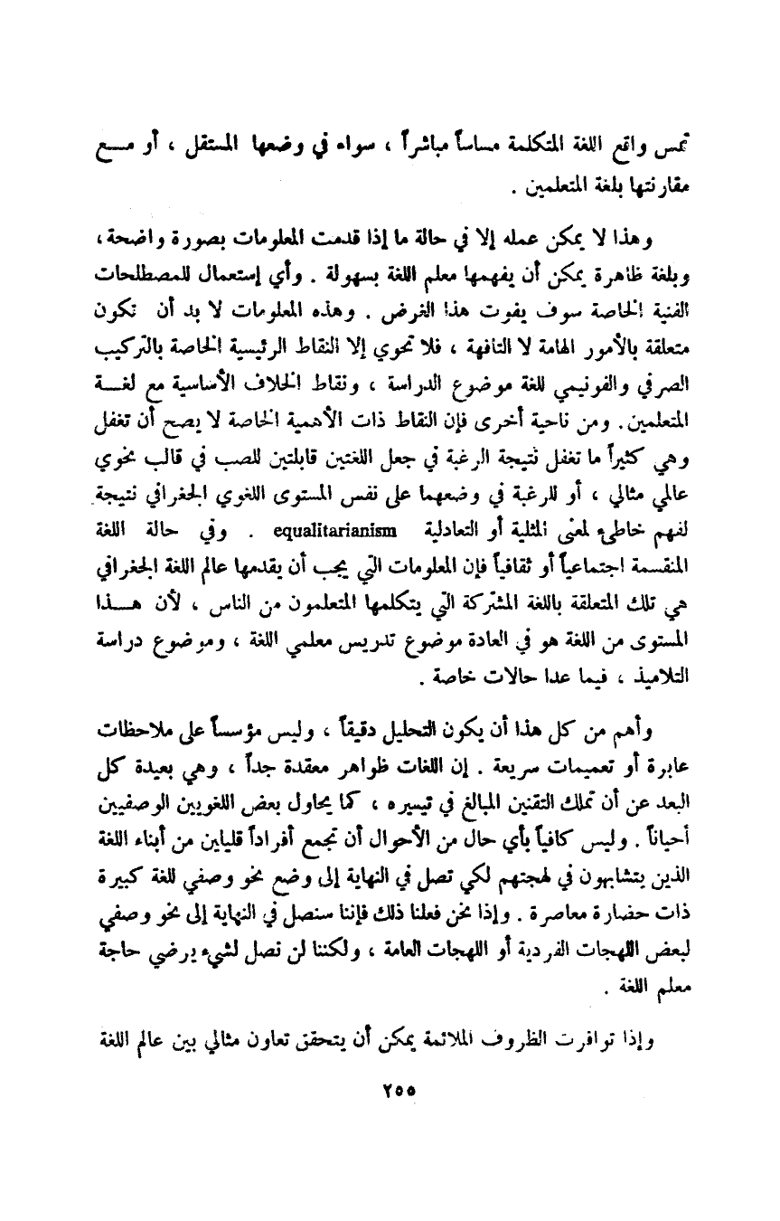 وأهم من كل هذا أن يكون التحليل دقيقا، وليس مؤسسا على ملاحظات عابرة أو تعميمات سريعة. إن اللغات ظواهر معقدة جدا، وهي بعيدة كل البعد عن أن تملك التقنين المبالغ في تيسيره، كما يحاول بعض اللغويين الوصفيين أحيانا, وليس كافيا بأي حال من الأحوال أن تجمع أفرادا قليلين من أبناء اللغة الذين يتشابهون في لهجتهم لكي تصل في النهاية إلى وضع نحو وصفي للغة كبيرة ذات حضارة معاصرة، وإذا نحن فعلنا ذلك فإننا سنصل في النهاية إلى نحو وصفي لبعض اللهجات الفردية أو اللهجات العامة، ولكننا لن نصل لشيء يرضي حاجة معلم اللغة.