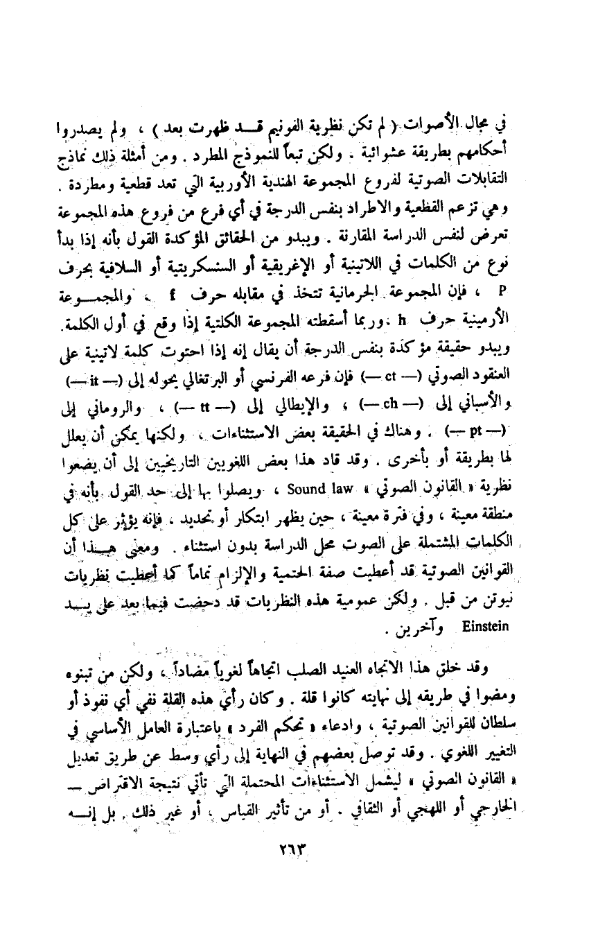 في مجال الأصوات "لم تكن نظرية الفونيم قد ظهرت بعد"، ولم يصدروا أحكامهم بطريقة عشوائية، ولكن تبعا للنموذج المطرد, ومن أمثلة ذلك نماذج التقابلات الصوتية لفروع المجموعة الهندية الأوربية التي تعد قطعية ومطردة, وهي تزعم القطعية والاطراد بنفس الدرجة في أي فرع من فروع هذه المجموعة تعرض لنفس الدراسة المقارنة، ويبدو من الحقائق المؤكدة القول بأنه إذا بدأ نوع من الكلمات في اللاتينية أو الإغريقية أو السنسكريتية أو السلافية بحرف p، فإن المجموعة الجرمانية تتخذ في مقابله حرف f، والمجموعة الأرمينية حرف h، وربما أسقطته المجموعة الكلتية إذا وقع في أول الكلمة ويبدو حقيقة مؤكدة بنفس الدرجة أن يقال: إنه إذا احتوت كلمة لاتينية على العنقود الصوتي "-ct-" فإن فرعه الفرنسي أو البرتغالي يحوله إلى "-it-" والإسباني إلى "-ch-"، والإيطالي إلى "-tt-"، والروماني إلى "-pt-", وهناك في الحقيقة بعض الاستثناءات، ولكنها يمكن أن يعلل لها بطريقة أو بأخرى, وقد قاد هذا بعض اللغويين التاريخيين إلى أن يضعوا نظرية "القانون الصوتي" Sound law، ويصلوا بها إلى حد القول بأنه في منطقة معينة، وفي فترة معينة، حين يظهر ابتكار أو تحديد، فإنه يؤثر على كل الكلمات المشتملة على الصوت محل الدراسة بدون استثناء، ومعنى هذا أن القوانين الصوتية قد أعطيت صفة الحتمية والإلزام تماما كما أعطيت نظريات نيوتن من قبل, ولكن عمومية هذه النظريات قد دحضت فيما بعد على يد Einstein وآخرين.