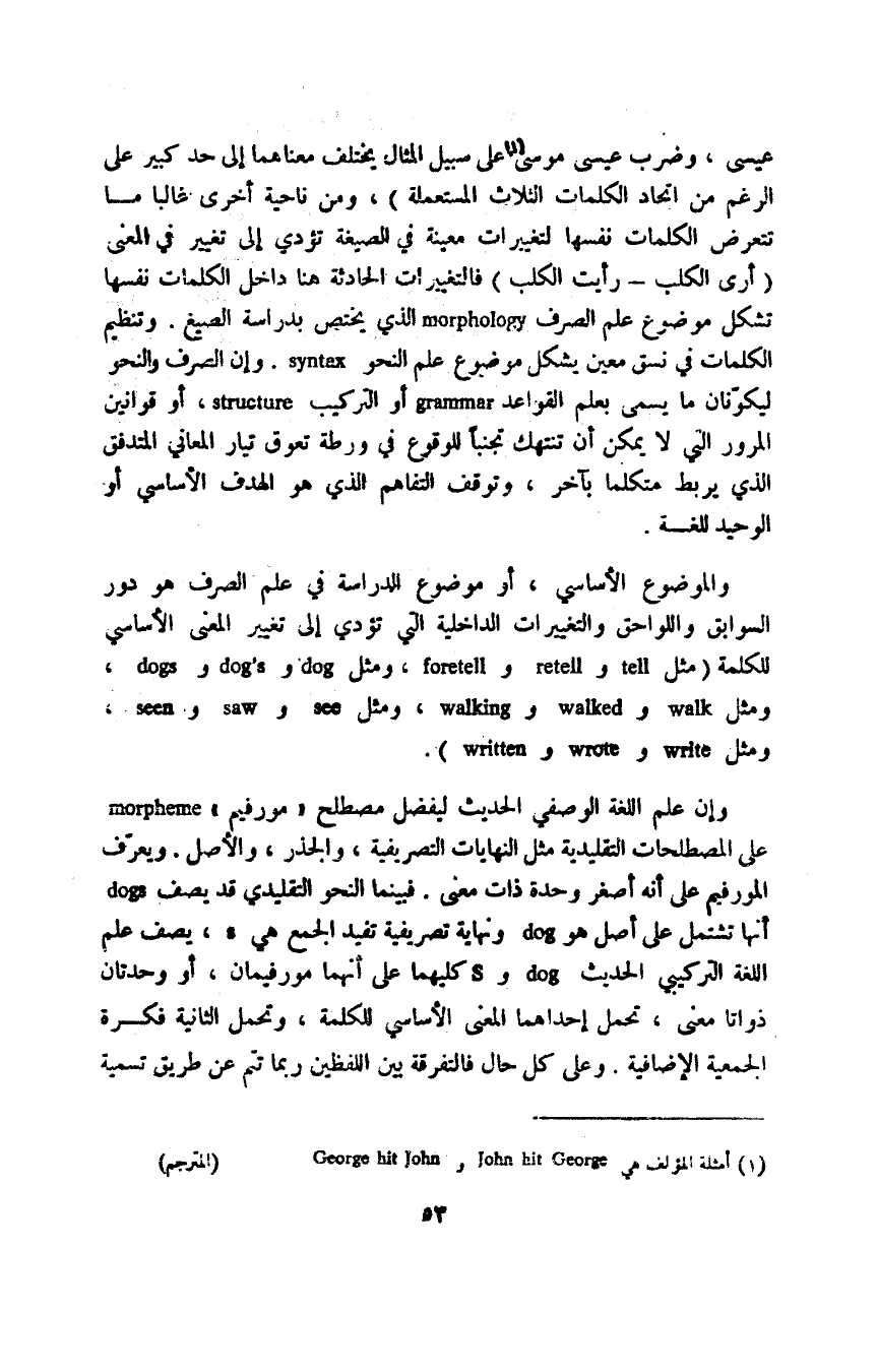 عيسى، وضرب عيسى موسى1 على سبيل المثال يختلف معناهما إلى حد كبير على الرغم من اتحاد الكلمات الثلاث المستعملة"، ومن ناحية أخرى غالبا ما تتعرض الكلمات نفسها لتغييرات معينة في الصيغة تؤدي إلى تغيير في المعنى "أرى الكلب, رأيت الكلب" فالتغييرات الحادثة هنا داخل الكلمات نفسها تشكل موضوع علم الصرف morphology الذي يختص بدراسة الصيغ. وتنظيم الكلمات في نسق معين يشكل موضوع علم النحو syntax. وإن الصرف والنحو ليكونان ما يسمى بعلم القواعد grammar أو التركيب structure, أو قوانين المرور التي لا يمكن أن تنتهك تجنبًا للوقوع في ورطة تعوق تيار المعاني، المتدفق الذي يربط متكلما بآخر، وتوفق التفاهم الذي هو الهدف الأساسي أو الوحيد للغة.