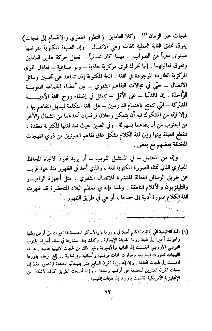 لهجات عبر الزمان1. وكلا العاملين "التطور الفطري والانقسام إلى لهجات" يعوق تحقق الغاية العملية للغات وهي الاتصال وإن الصيغة المكتوبة بفرضها مستوى معينًا من الصواب -مهما كان تعسفيًا- تعطل حركة هذين العاملين وتعوق فعاليتهما، إنها تحرك قوى مركزية جاذبة -ولو صناعية- تعادل القوى المركزية الطاردة الموجودة في اللغة. اللغة المكتوبة إذن تساعد على تحسين وسائل الاتصال -حتى في مجالات التفاهم الشفوي- بين أعضاء الجماعة اللغوية الواحدة "إن فائدتها -على الأقل- تتمثل في إضفاء روح اللغة الأدبية المشتركة -التي تتمتع باهتمام الدارسين- على اللغة المتكلمة ليسهل التفاهم بها، وإلا فإنه من المشكوك فيه أن يتمكن رجلان فرنسيان أحدهما من الشمال والآخر من الجنوب من أن يتفاهما بسهولة وفي الصين حيث نعد لغتها المكتوبة معقدة، تتقطع الصلة بينها وبين لغة الكلام بشكل عاق تفاهم الصينيين من ذوي اللهجات المختلفة بعضهم مع بعض.