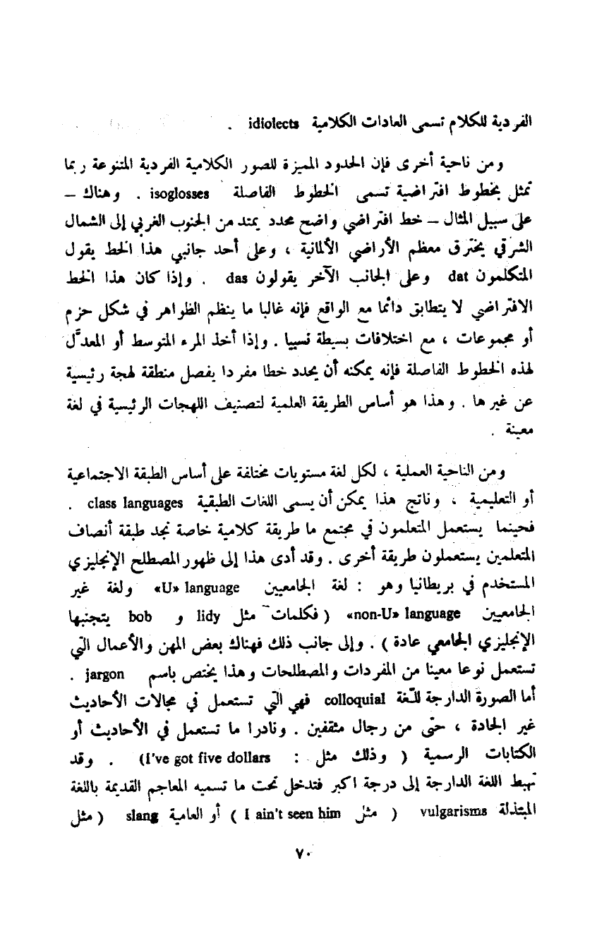 class languages. فحينما يستعمل المتعلمون في مجتمع ما طريقة كلامية خاصة نجد طبقة أنصاف المتعلمين يستعملون طريقة أخرى. وقد أدى هذا إلى ظهور المصطلح الإنجليزي المستخدم في بريطانيا وهو: لغة الجامعيين "U"language. ولغة غير الجامعيين "non-U"language "فكلمات مثل lidy وbob يتجنبها الإنجليزي الجامعي عادة" وإلى جانب ذلك فهناك بعض المهن، والأعمال التي تستعمل نوعا معينا من المفردات والمصطلحات وهذا يختص باسم jargon. أما الصورة الدارجة للغة colloquial فهي التي تستعمل في مجالات الأحاديث غير الجادة، حتى من رجال مثقفين، ونادرا ما تستعمل في الأحاديث أو