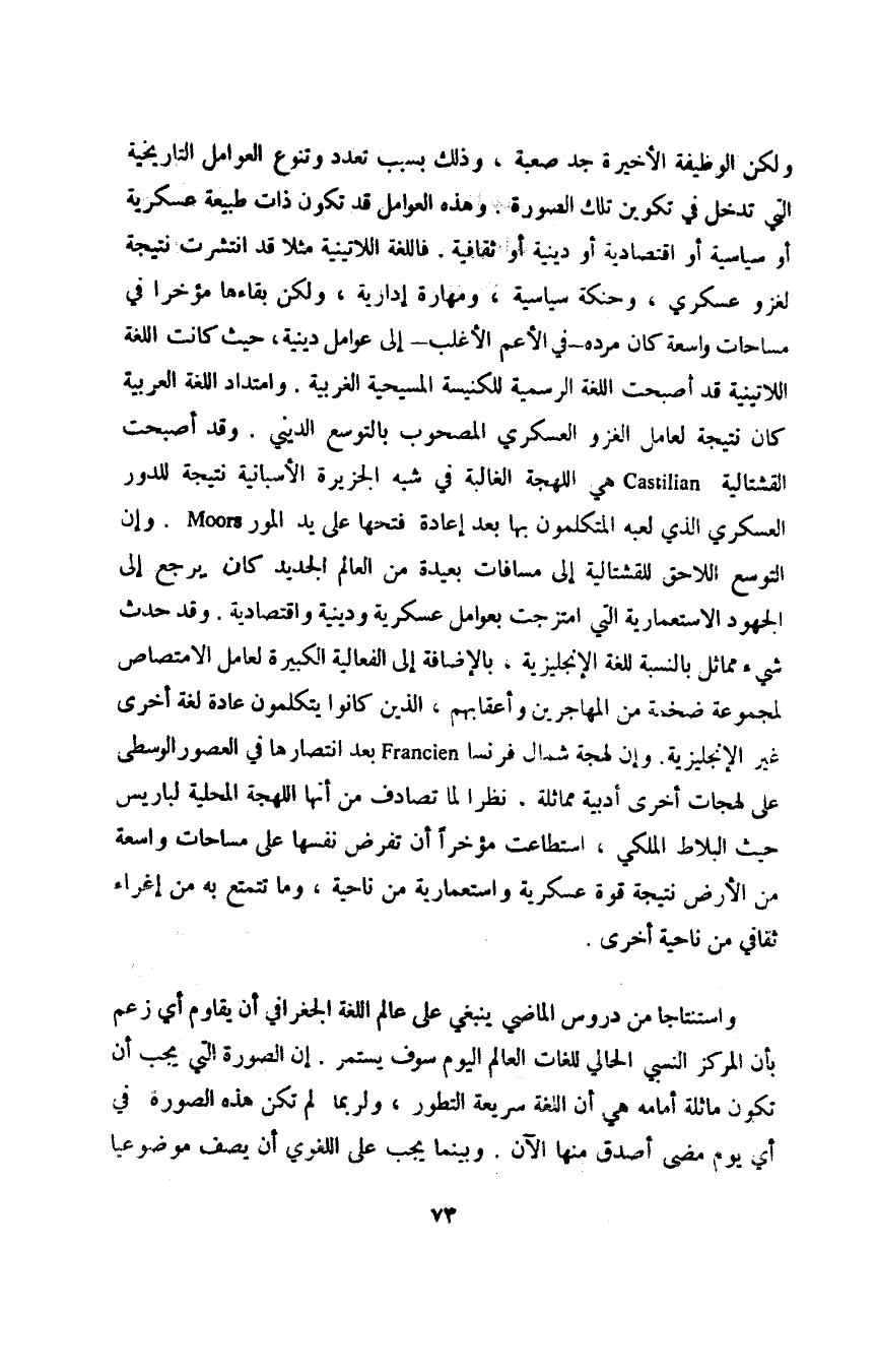 ولكن الوظيفة الأخيرة جد صعبة، وذلك بسبب تعدد وتنوع العوامل التاريخية التي تدخل في تكوين تلك الصورة، وهذه العوامل قد تكون ذات طبيعة عسكرية أو سياسية أو اقتصادية أو دينية أو ثقافية. فاللغة اللاتينية مثلا قد انتشرت نتيجة لغزو عسكري، وحنكة سياسية، ومهارة إدارية، ولكن بقاءها مؤخرا في مساحات واسعة كان مرده -في الأعم الأغلب- إلى عوامل دينية، حيث كانت اللغة اللاتينية قد أصبحت اللغة الرسمية للكنيسة المسيحية الغربية، وامتداد اللغة العربية كانت نتيجة لعالم الغزو العسكري المصحوب بالتوسع الديني، وقد أصبحت القشتالية Castilian هي اللهجة الغالبة في شبه الجزيرة الإسبانية نتيجة للدور العسكري الذي لعبه المتكلمون بها بعد إعادة فتحها على يد المور Moors. وإن التوسع اللاحق للقشتالية إلى مسافات بعيدة من العالم الجديد كان يرجع إلى الجهود الاستعمارية التي امتزجت بعوامل عسكرية ودينية واقتصادية، وقد حدث شيء مماثل بالنسبة للغة الإنجليزية، بالإضافة إلى الفعالية الكبيرة لعامل الامتصاص لمجموعة ضخمة من المهاجرين وأعقابهم، الذين كانوا يتكلمون عادة لغة أخرى غير الإنجليزية، وإن لهجة شمال فرنسا Francien بعد انتصارها في العصور الوسطى على لهجات أخرى أدبية مماثلة، نظرا لما تصادف من أنها اللهجة المحلية لباريس حيث البلاط الملكي، استطاعت مؤخرًا أن تفرض نفسها على مساحات واسعة من الأرض نتيجة قوة عسكرية واستعمارية من ناحية، وما تتمتع به من إغراء ثقافي من ناحية أخرى.