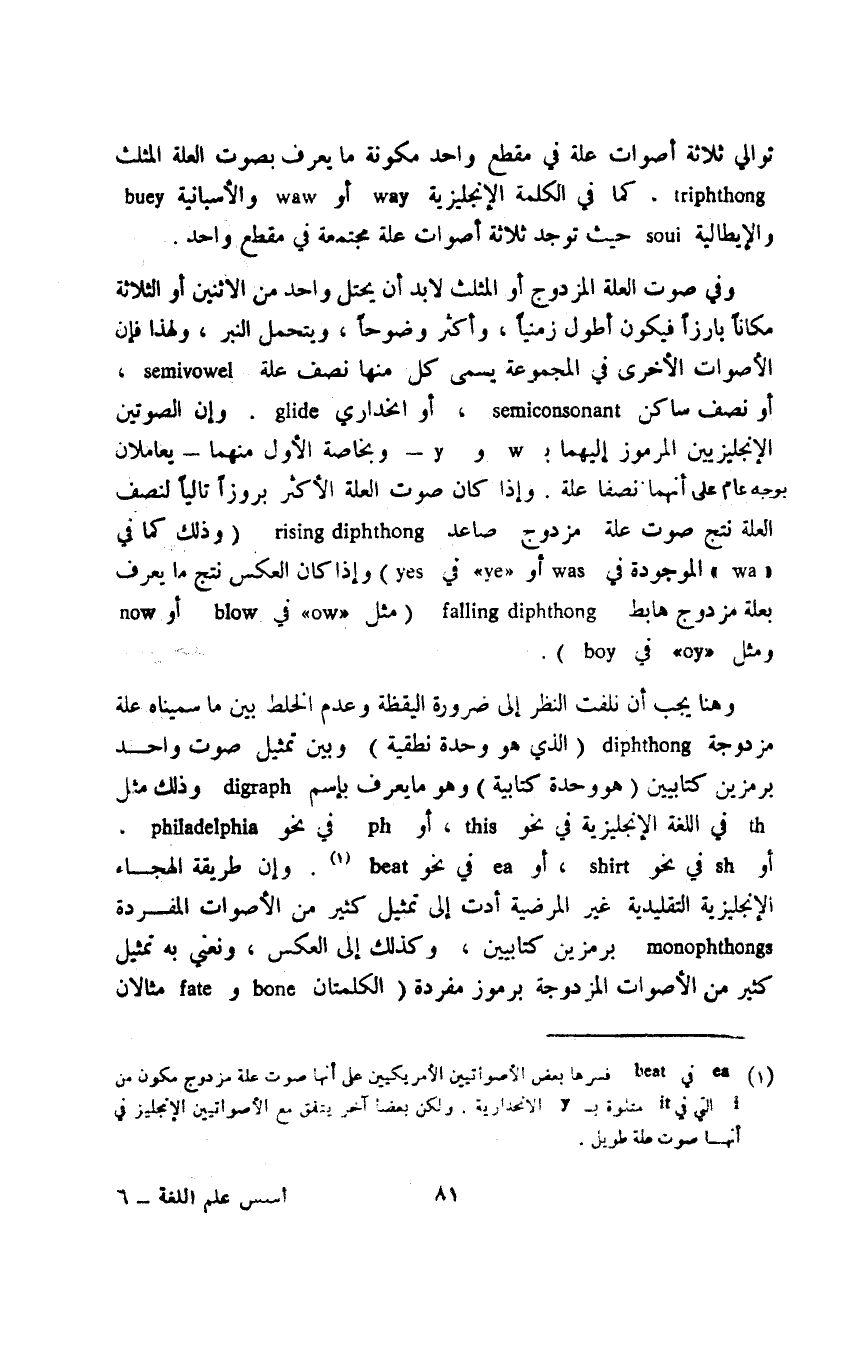وهنا يجب أن نلفت النظر إلى ضرورة اليقظة وعدم الخلط بين ما سميناه علة مزدوجة diphthong "الذي هو وحدة نطقية" وبين تمثيل صوت واحد برمزين كتابيين "وهو وحدة كتابية" وهو ما يعرف باسم digraph وذلك مثل th في اللغة الإنجليزية في نحو this، أو ph في نحو philadelphis, أو sh في نحو shirt، أو ea في نحو beat1. وإن طريقة الهجاء الإنجليزية التقليدية غير المرضية أدت إلى تمثيل كثير من الأصوات المفردة monophthongs برمزين كتابيين، وكذلك إلى العكس، ونعني به تمثيل كثير من الأصوات المزدوجة برموز مفردة "الكلمتان bone و fate مثالان
