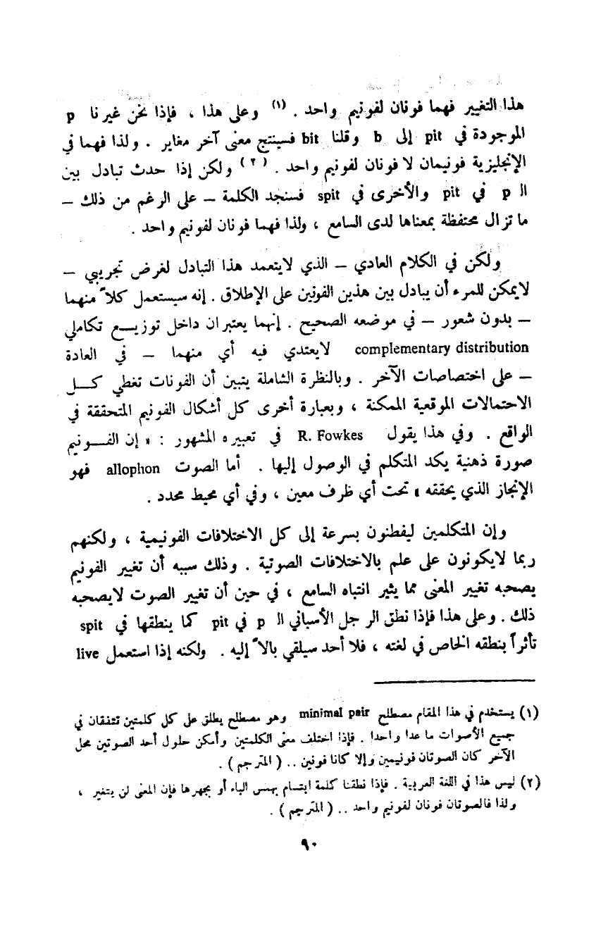 1 يستخدم في هذا المقام مصطلح minmal pair وهو مصطلح يطلق على كل كلمتين تتفقان في جميع الأصوات ما عدا واحدا، فإذا اختلف معنى الكلمتين وأمكن حلول أحد الصوتين محل الآخر كان الصوتان فونيمين وإلا كانا فونين ... "المترجم".