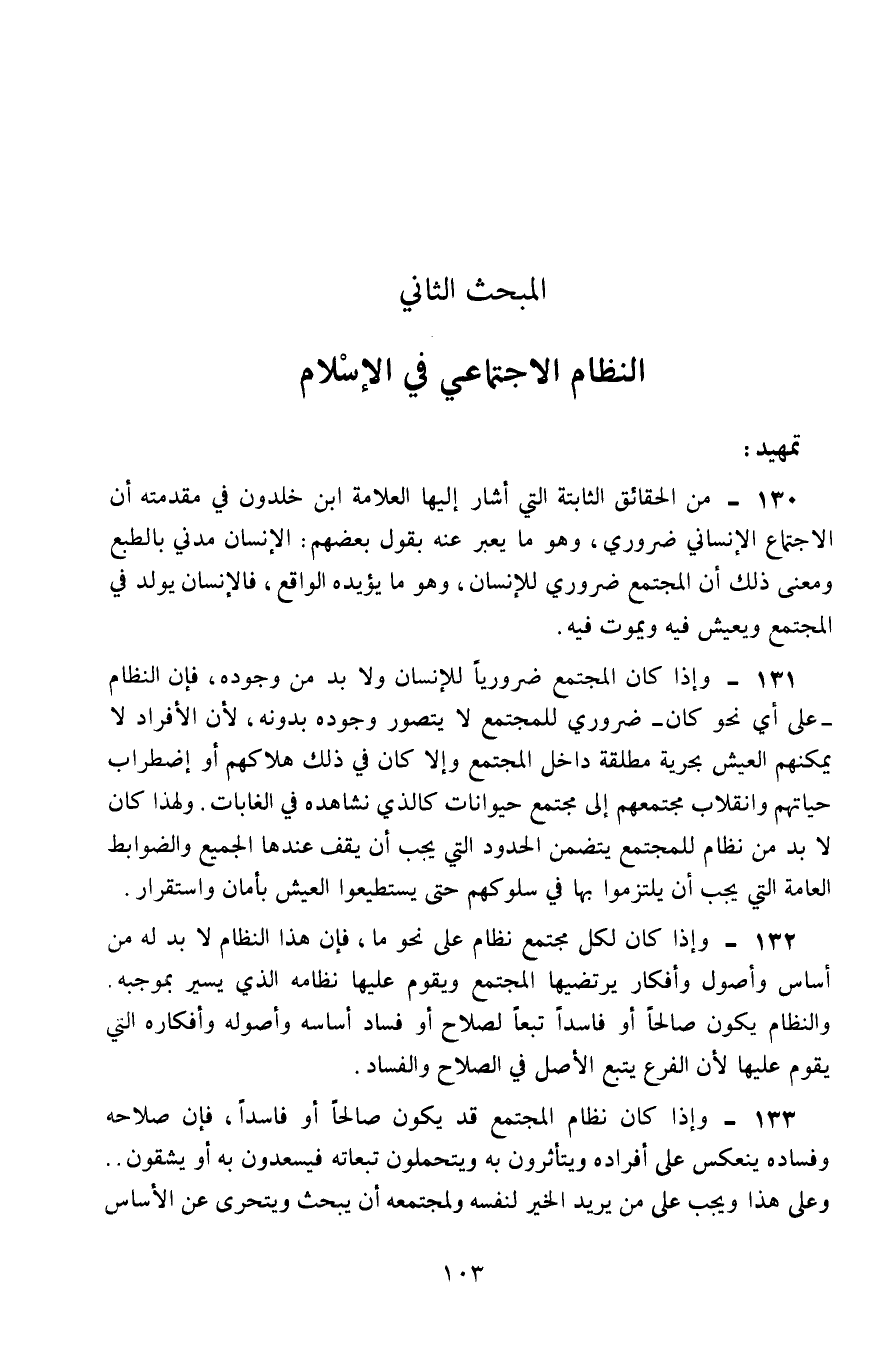 130- من الحقائق الثابتة التي أشار إليها العلَّامة ابن خلدون في مقدمته أنَّ الاجتماع الإنساني ضروري، وهو ما يعبّر عنه بقول بعضهم: الإنسان مدني بالطبع، ومعنى ذلك أنَّ المجتمع ضروري للإنسان، وهو ما يؤيده الواقع، فالإنسان يولد في المجتمع ويعيش فيه ويموت فيه.