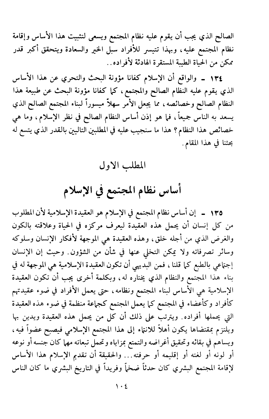 134- والواقع أن الإسلام كفانا مئونة البحث والتحرِّي عن هذا الأساس الذي يقوم عليه النظام الصالح والمجتمع، كما كفانا مئونة البحث عن طبيعة هذا النظام الصالح وخصائصه، مما يجعل الأمر سهلًا ميسورًا لبناء المجتمع الصالح الذي يسعد به الناس جميعًا، فما هو إذن أساس النظام الصالح في نظر الإسلام. وما هي خصائص هذا النظام؟ هذا ما سنجيب عليه في المطلبين التاليين الذي يتَّسع له بحثنا في هذا المقام.