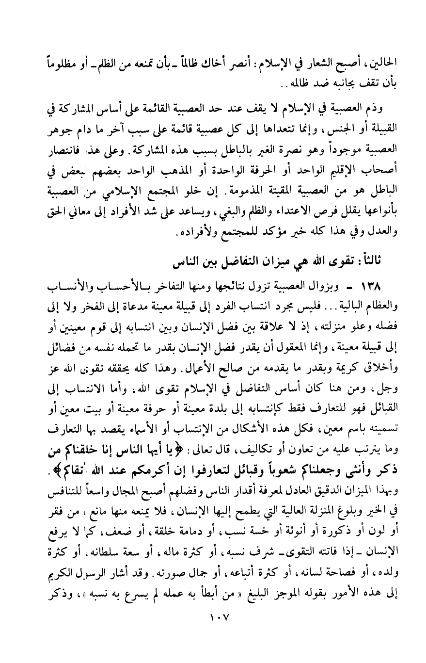 138- وبزوال العصبية تزول نتائجها، ومنها: التفاخر بالأحساب والأنساب والعظام البالية، فليس مجرَّد انتساب الفرد إلى قبيلة معينة مدعاة إلى الفخر، ولا إلى فضله وعلو منزلته؛ إذ لا علاقة بين فضل الإنسان وبين انتسابه إلى قوم معينين، أو إلى قبيلة معينة، وإنما المعقول أن يقدَّر فضل الإنسان بقدر ما تحمله نفسه من فضائل وأخلاق كريمة، وبقدر ما يقدّمه من صالح الأعمال. وهذا كله يحققه تقوى الله -عز وجل، ومن هنا كان أساس التفاضل في الإسلام تقوى الله، وأمَّا الانتساب إلى القبائل فهو للتعارف فقط، كانتسابه إلى بلدة معينة أو حرفة معينة أو بيت معين، أو تسميته باسم معين، فكل هذه الأشكال من الانتساب أو الأسماء يقصد بها التعارف وما يترتب عليه من تعاون أو تكاليف، قال تعالى: {أَيُّهَا النَّاسُ إِنَّا خَلَقْنَاكُمْ مِنْ ذَكَرٍ وَأُنْثَى وَجَعَلْنَاكُمْ شُعُوبًا وَقَبَائِلَ لِتَعَارَفُوا إِنَّ أَكْرَمَكُمْ عِنْدَ اللَّهِ أَتْقَاكُمْ} .