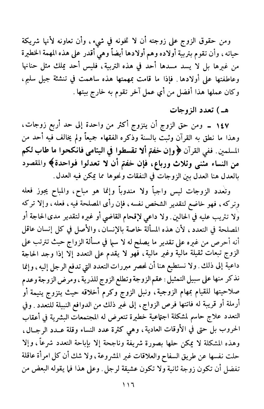147- ومن حق الزوج أن يتزوَّج أكثر من واحدة إلى حد أربع زوجات، وهذا ما نطق به القرآن وثبت بالسُّنة وذكره الفقهاء جميعًا، ولم يخالف فيه أحد من المسلمين، ففي القرآن: {وَإِنْ خِفْتُمْ أَلَّا تُقْسِطُوا فِي الْيَتَامَى فَانْكِحُوا مَا طَابَ لَكُمْ مِنَ النِّسَاءِ مَثْنَى وَثُلَاثَ وَرُبَاعَ فَإِنْ خِفْتُمْ أَلَّا تَعْدِلُوا فَوَاحِدَةً} ، والمقصود بالعدل هنا العدل بين الزوجات في النفقات ونحوها مما يمكن فيه العدل،