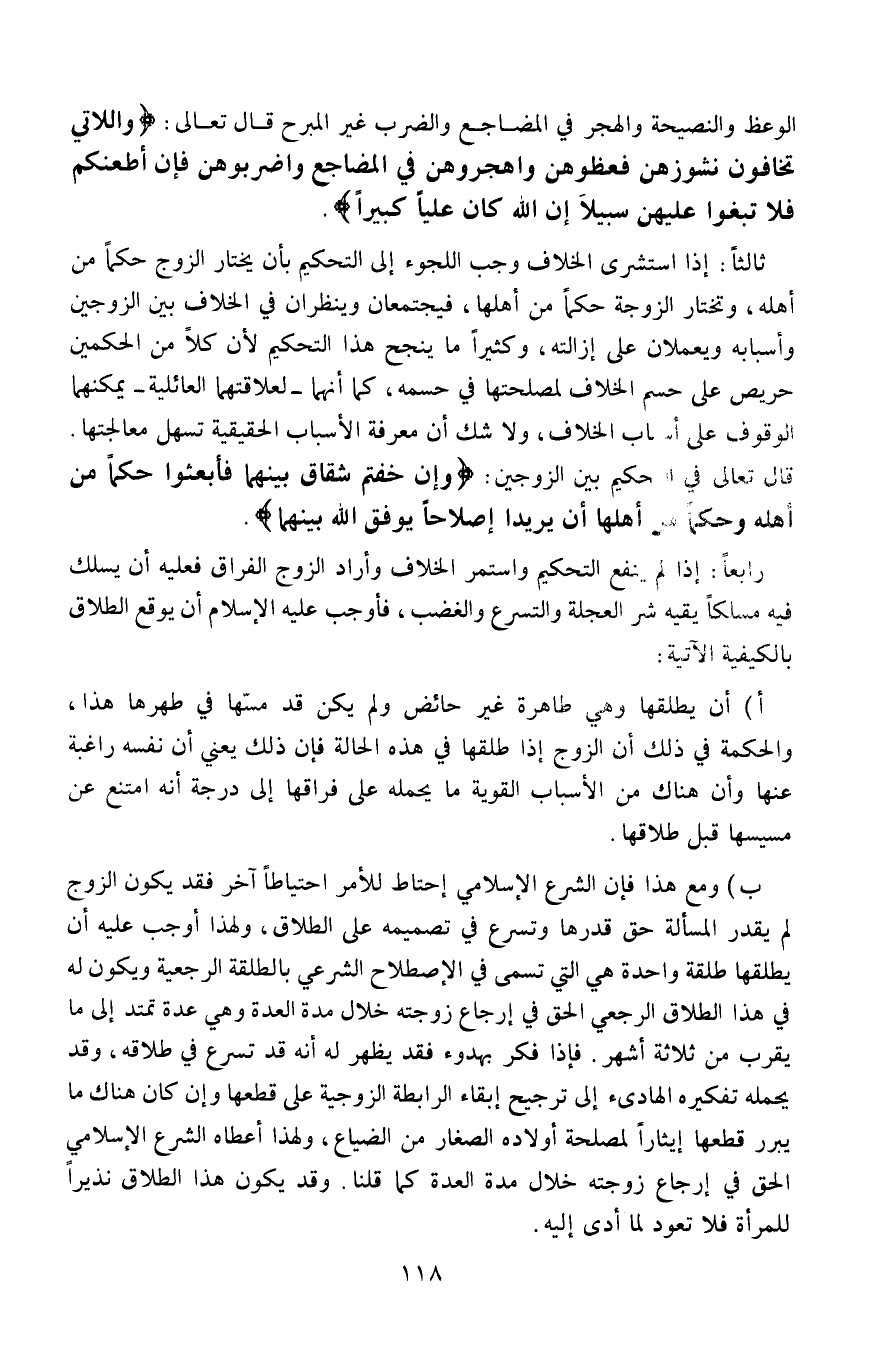 ب- ومع هذا فإنَّ الشرع الإسلامي احتاط احتياطًا آخر، فقد يكون الزوج لم يقدِّر المسألة حقَّ قدرها، وتسرَّع في تصميمه على الطلاق، ولهذا أوجب عليه أن يطلقها طلقة واحدة، هي التي تسمى في الاصطلاح الشرعي بالطلقة الرجعية، ويكون له في هذا الطلاق الرجعي الحقّ في إرجاع زوجته خلال مدة العدة، وهي عدة تمتد إلى ما يقرب من ثلاثة أشهر، فإذا فكَّر بهدوء فقد يظهر له أنَّه قد تسرَّع في طلاقه، وقد يحمله تفكيره الهادئ إلى ترجيح إبقاء الرابطة الزوجية على قطعها، وإن كان هناك ما يبرر قطعها إيثارًا لمصلحة أولاده الصغار من الضياع، ولهذا أعطاه الشرع الإسلامي الحق في إرجاع زوجته خلال مدة العدة كما قلنا، وقد يكون هذا الطلاق نذيرًا للمرأة، فلا تعود لما أدَّى إليه.