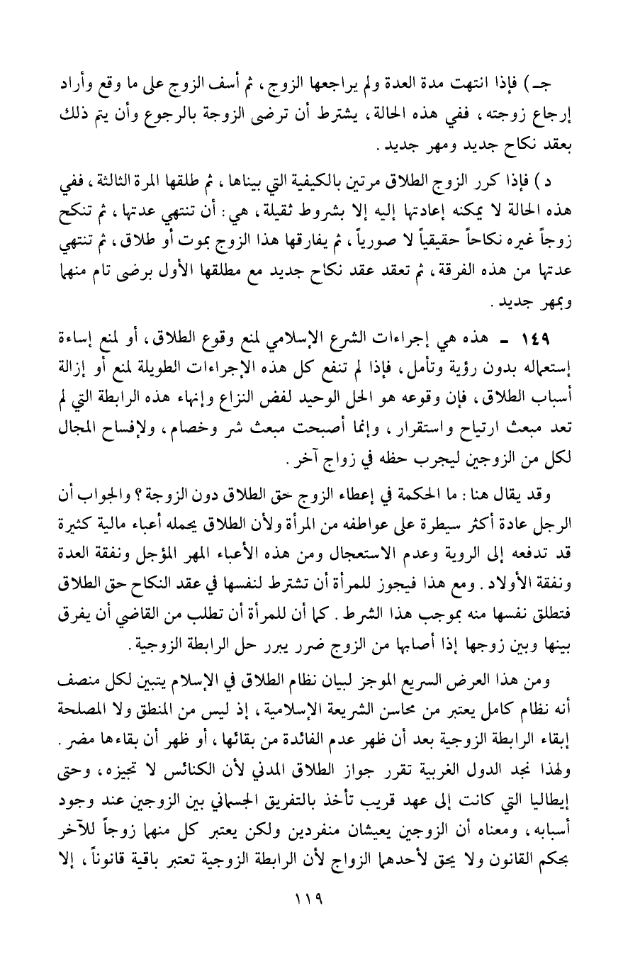 149- هذه هي إجراءات الشرع الإسلامي لمنع وقوع الطلاق، أو لمنع إساءة استعماله بدون رويِّة وتأمّل، فإذا لم تنفع كل هذه الإجراءات الطويلة لمنع أو إزالة أسباب الطلاق، فإنَّ وقوعه هو الحلّ الوحيد لفضِّ النزاع، وإنهاء هذه الرابطة التي لم تعد مبعث ارتياح واستقرار، وإنَّما أصبحت مبعث شر وخصام، ولإفساح المجال لكلٍّ من الزوجين ليجرِّب حظه في زواج آخر.