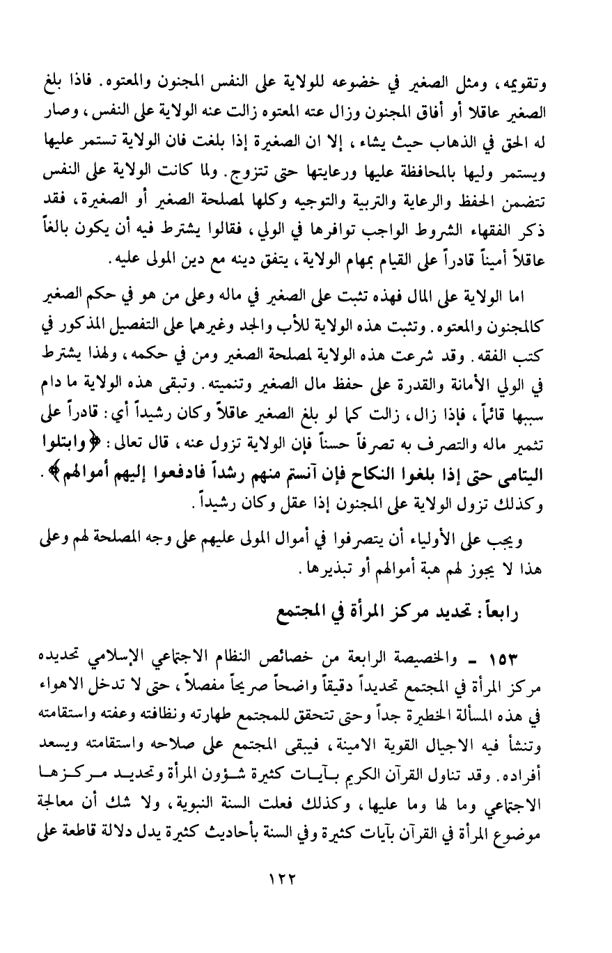 153- والخصيصة الرابعة من خصائص النظام الاجتماعي الإسلامي تحديده مركز المرأة في المجتمع دقيقًا واضحًا صريحًا مفصَّلًا، حتى لا تدخل الأهواء في هذه المسألة الخطيرة جدًّا، وحتى تتحقق للمجتمع طهارته ونظافته وعفَّته واستقامته، وتنشأ فيه الأجيال القوية الأمينة، فيبقى المجتمع على صلاحه واستقامته ويسعد أفراده، وقد تناول القرآن الكريم بآيات كثيرة شئون المرأة وتحديد مركزها الاجتماعي، وما لها وما عليها، وكذلك فعلت السنة النبوية، ولا شَكَّ أنَّ معالجة موضع المرأة في القرآن بآيات كثيرة، وفي السنة بأحاديث كثيرة، يدل دلالة قاطعة على