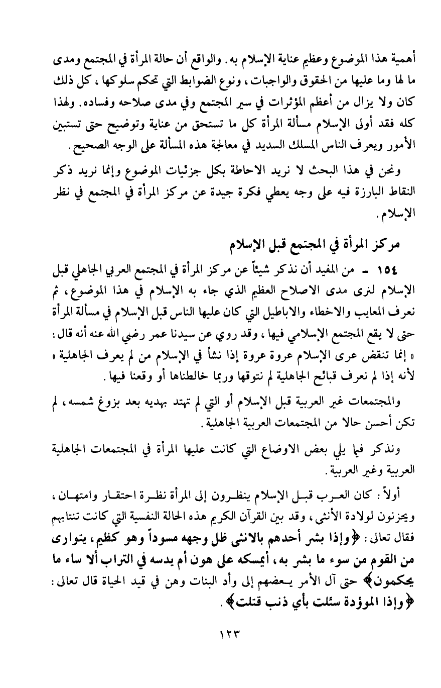 154- من المفيد أن نذكر شيئًا عن مركز المرأة في المجتمع العربي الجاهلي قبل الإسلام؛ لترى مدة الإصلاح العظيم الذي جاء به الإسلام في هذا الموضوع، ثم نعرف المعايب والأخطاء والأباطيل التي كان عليها الناس قبل الإسلام في مسألة المرأة، حتى لا يقع المجتمع الإسلامي فيها، وقد روي عن سيدنا عمر -رضي الله عنه- أنه قال: "إنما تنقض عرى الإسلام عروة عروة، إذا نشأ في الإسلام من لم يعرف الجاهلية"؛ لأنه إذا لم نعرف قبائح الجاهلية لم نتوقها، وربما خالطناها أو وقعنا فيها.