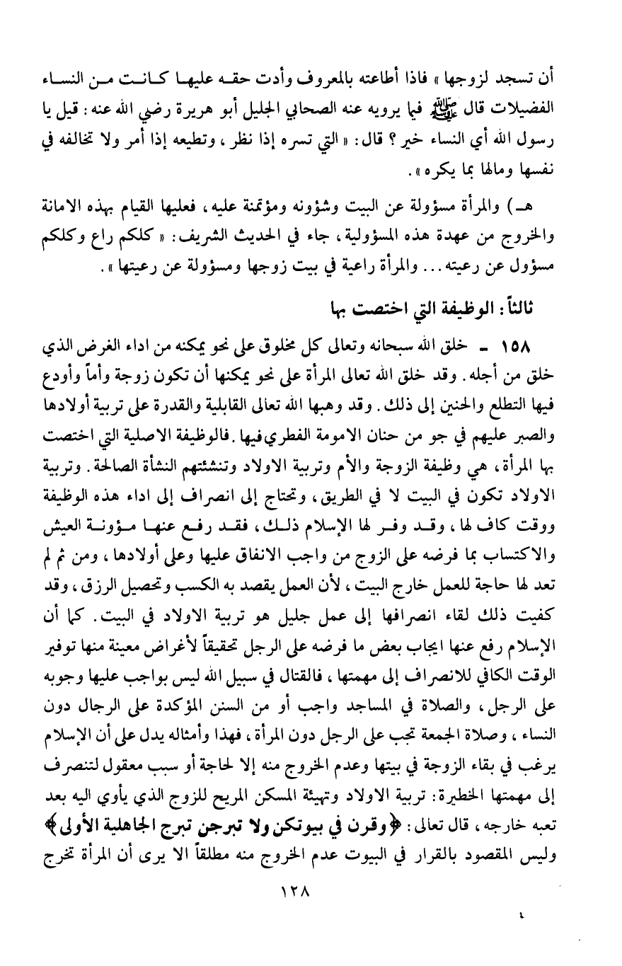 158- خلق الله -سبحانه وتعالى- كلَّ مخلوق على نحوٍ يمكِّنه من أداء الغرض الذي خُلِقَ من أجله، وقد خلق الله تعالى المرأة على نحوٍ يمكِّنُها أن تكون زوجة وأمًّا، وأودع فيها التطلع والحنين إلى ذلك، وقد وهبها الله تعالى القابلية والقدرة على تربية أولادها، والصبر عليهم في جوٍّ من حنان الأمومة الفطرية بها. فالوظيفة الأصلية التي اختصت بها المرأة هي وظيفة الزوجة والأم، وتربية الأولاد وتنشئتهم النشأة الصالحة، وتربية الأولاد تكون في البيت لا في الطريق، وتحتاج إلى انصراف إلى أداء هذه الوظيفة ووقت كافٍ لها، وقد وفَّر لها الإسلام ذلك، فقد رفع عنها مؤنة العيش والاكتساب بما فرضه على الزوج من واجب الإنفاق عليها وعلى أولادها، ومن ثَمَّ تعد لها حاجة للعمل خارج البيت؛ لأنَّ العمل يُقْصَد به الكسب وتحصيل الرزق، وقد كفيت ذلك لقاء انصرافها إلى عمل جليل هو تربية الأولاد في البيت. كما أنَّ الإسلام رعف عنها إيجاب بعض ما فرضه على الرجل تحقيقًا لأغراض معينة منها: توفير الوقت الكافي للانصراف إلى مهمتها، فالقتال في سبيل الله ليس بواجبٍ عليها وجوبه على الرجل، والصلاة في المساجد واجب أو من السنن المؤكدة على الرجال دون النساء، وصلاة الجمعة تجب على الرجل دون المرأة، فهذا وأمثاله يدل على أنَّ الإسلام يرغِّب في بقاء الزوجة في بيتها، وعدم الخروج منه إلّا لحاجة أو سبب معقول؛ لتنصرف إلى مهمتها الخطيرة: تربية الأولاد وتهيئة المسكن المريح للزوج الذي يأوي إليه بعد تعبه خارجه، قال تعالى: {وَقَرْنَ فِي بُيُوتِكُنَّ وَلا تَبَرَّجْنَ تَبَرُّجَ الْجَاهِلِيَّةِ الأُولَى} وليس المقصود بالقرار في البيوت عدم الخروج منه مطلقًا، ألَا يرى أن المرأة تخرج
