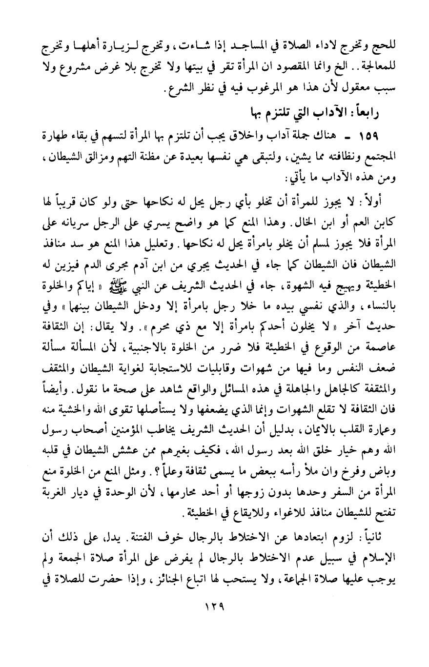 159- هناك جملة آداب وأخلاقٍ يجب أن تلتزم بها المرأة لتسهم في بقاء طهارة المجتمع ونظافته مما يشين، ولتبقى هي نفسها بعيدة عن مظنَّة التُّهَم ومزالق الشيطان، ومن هذه الآداب ما يأتي: