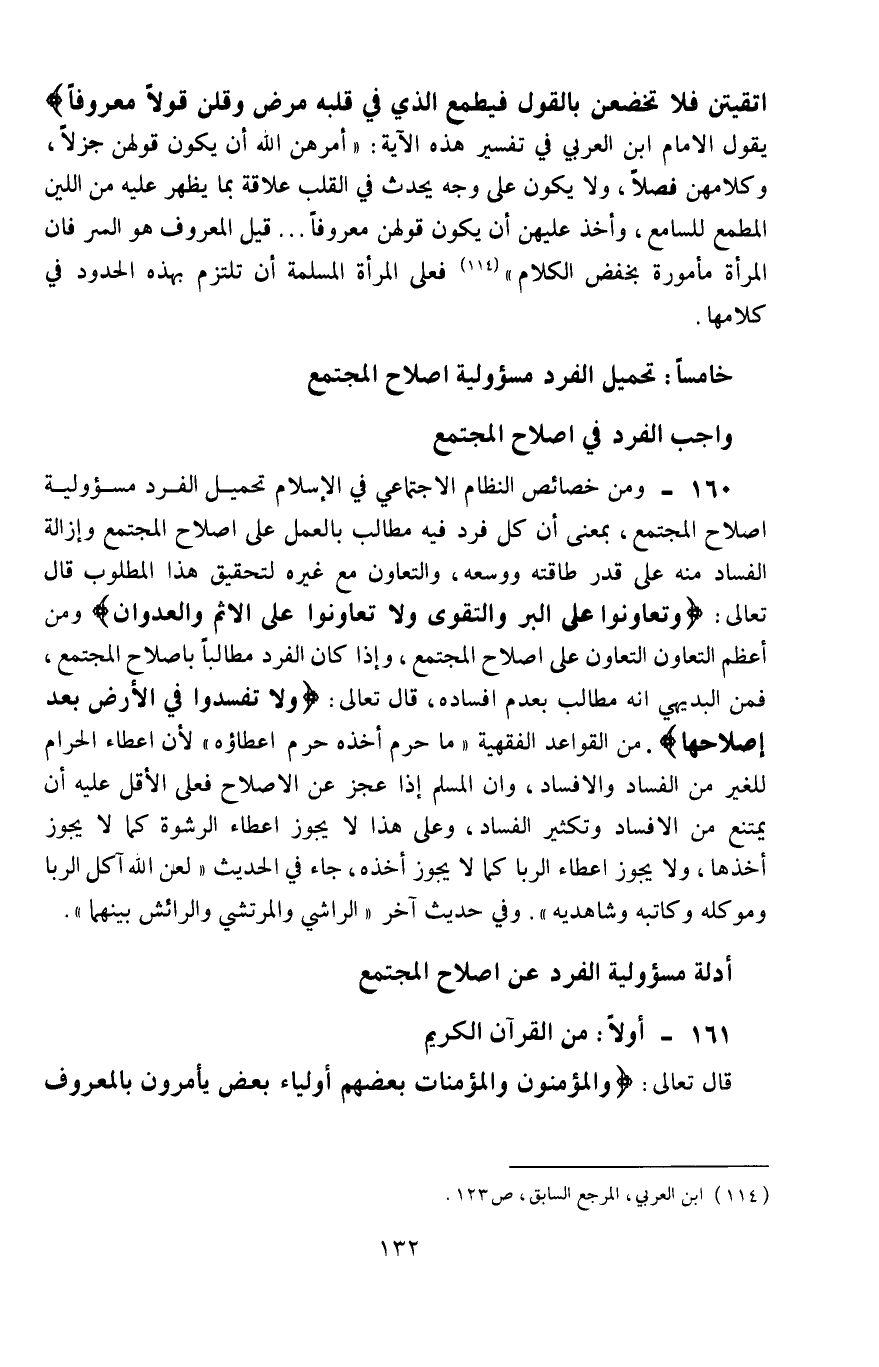 160- ومن خصائص النظام الاجتماعي في الإسلام تحميل الفرد مسئولية إصلاح المجتمع، بمعنى أنَّ كل فرد فيه مطالب بالعمل على إصلاح المجتمع وإزالة الفساد منه على قدر طاقته ووسعه، والتعاون مع غيره لتحقيق هذا المطلوب، قال تعالى: {وَتَعَاوَنُوا عَلَى الْبِرِّ وَالتَّقْوَى وَلا تَعَاوَنُوا عَلَى الإِثْمِ وَالْعُدْوَانِ} ، ومن أعظم التعاونِ التعاونُ على إصلاح المجتمع، وإذا كان الفرد مطالبًا بإصلاح المجتمع، فمن البديهي أنَّه مطالب بعدم إفساده، قال تعالى: {وَلَا تُفْسِدُوا فِي الْأَرْضِ بَعْدَ إِصْلَاحِهَا} . من القواعد الفقهية "ما حرِّم أخذه حرِّم إعطاؤه"؛ لأنَّ إعطاء الحرام للغير من الفساد والإفساد، وعلى هذا لا يجوز إعطاء الرشوة، كما لا يجوز أخذها، ولا يجوز إعطاء الربا، كما لا يجوز أخذه، جاء في الحديث: "لعن الله آكل الربا وموكله وكاتبه وشاهديه"، وفي حديث آخر: "الراشي والمرتشي والرائش بينهما".