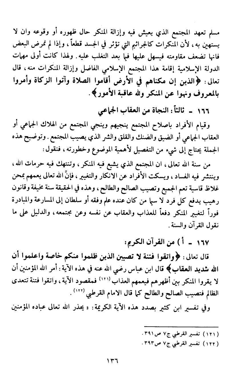 قال تعالى: {وَاتَّقُوا فِتْنَةً لَا تُصِيبَنَّ الَّذِينَ ظَلَمُوا مِنْكُمْ خَاصَّةً وَاعْلَمُوا أَنَّ اللَّهَ شَدِيدُ الْعِقَابِ} ، قال ابن عباس -رضي الله عنه- في هذه الآية: أمر الله المؤمنين أن لا يقروا المنكر بين أظهرهم فيعهم العذاب2، فمقصود الآية: واتقوا فتنة تتعدَّى الظالم فتصيب الصالح والطالح، كما قال الإمام القرطبي2.