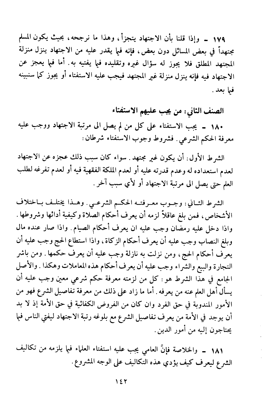 181- والخلاصة: فإنَّ العامي يجب عليه استفتاء العلماء فيما يلزمه من تكاليف الشرع؛ ليعرف كيف يؤدي هذه التكاليف على الوجه المشروع.