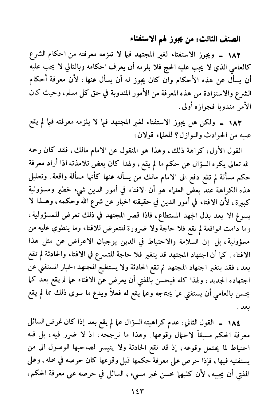 183- ولكن هل يجوز الاستفتاء لغير المجتهد فيما لا يلزمه معرفته فيما لم يقع عليه من الحوادث والنوازل؟ للعلماء قولان: